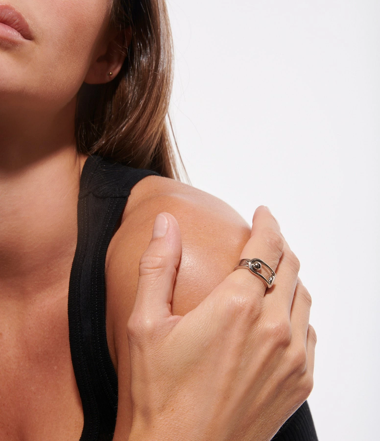 Bague en laiton trempé dans un bain de palladium avec détail boucle à fermoir. Logo gravé à l’intérieur de l’anneau.