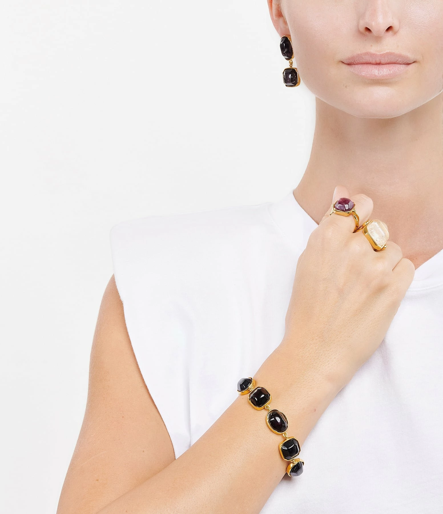 Bague en plaqué or, ornée d’une pierre de cristal de roche teintée à la main en violet.