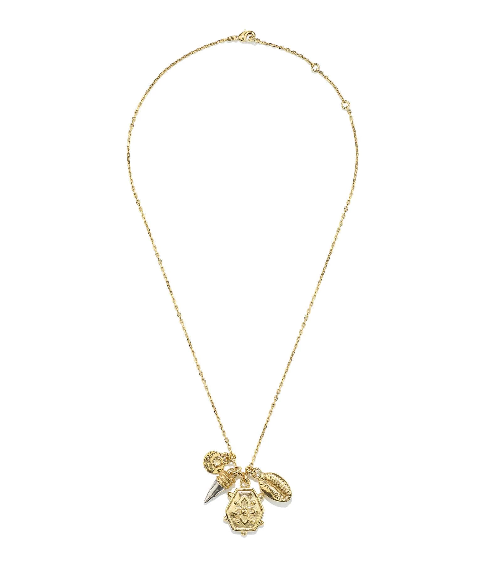 Collier sur chaîne en métal trempé dans un bain d’or 24 carats orné de quatre pendentifs. Un pendentif pampille Goossens en plaqué or décoré d’une pierre cristal de roche. Un pendentif coquillage plaqué or. Un pendentif dent en palladium. Un pendentif médaille. Fermoir classique à ressort avec contre-anneau.