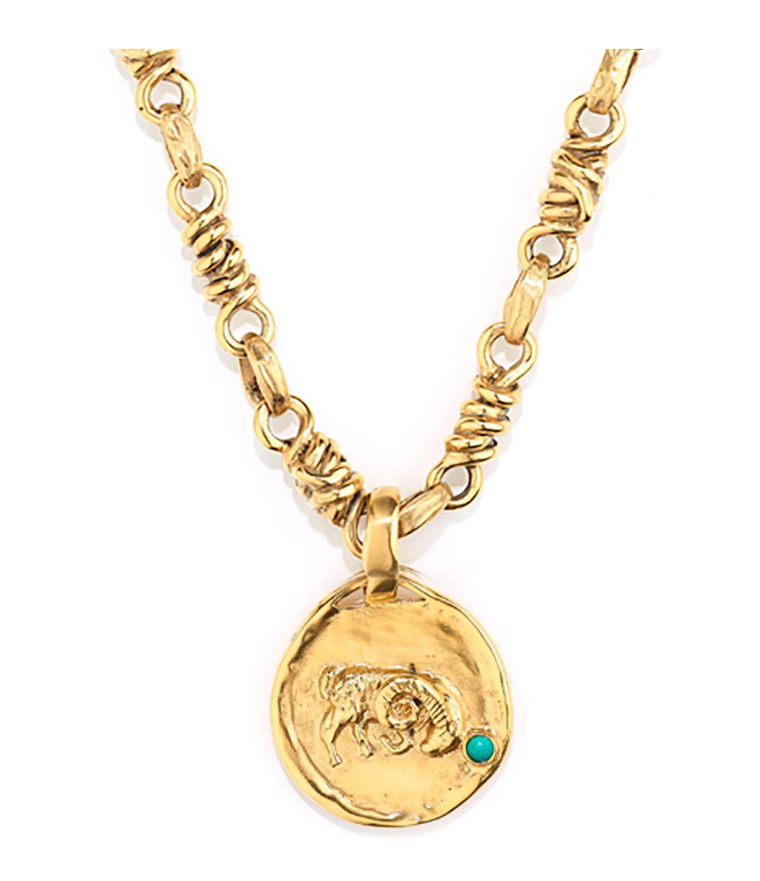 Collier en plaqué or, orné d’un médaillon du signe astrologique du Bélier, décoré d’une turquoise. Fermoir en S avec contre-anneau.