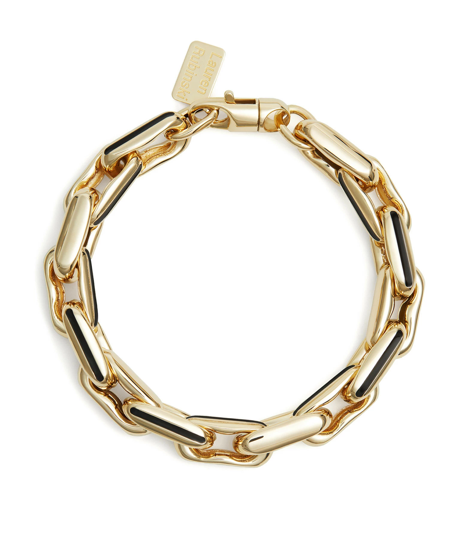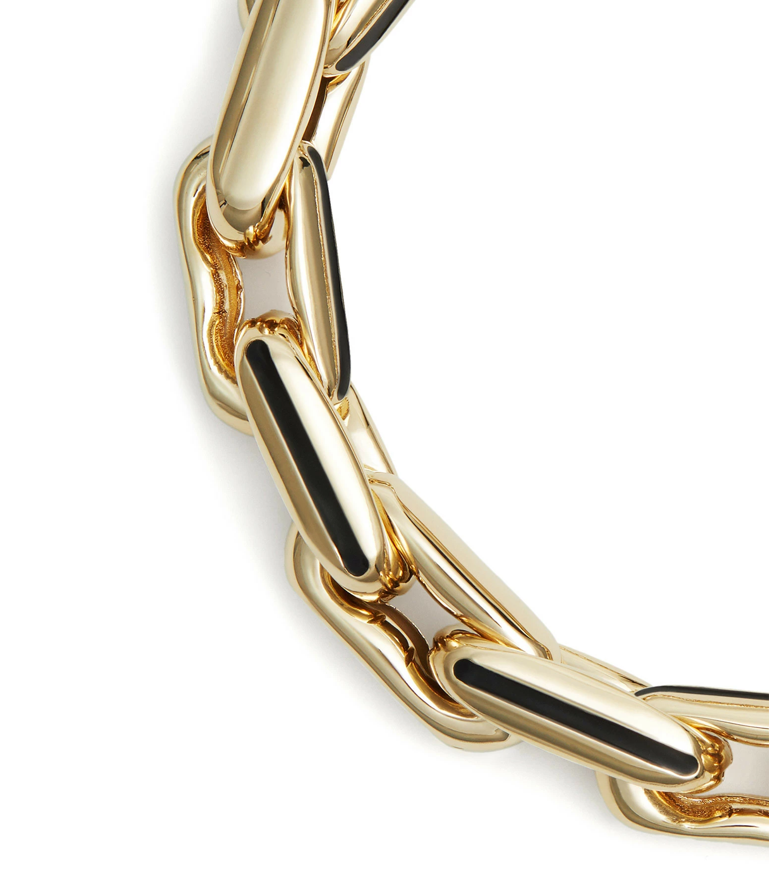 Bracelet façon gourmette en or creux et détails noirs composé de maillons entrecroisés. Fermoir mousqueton.
