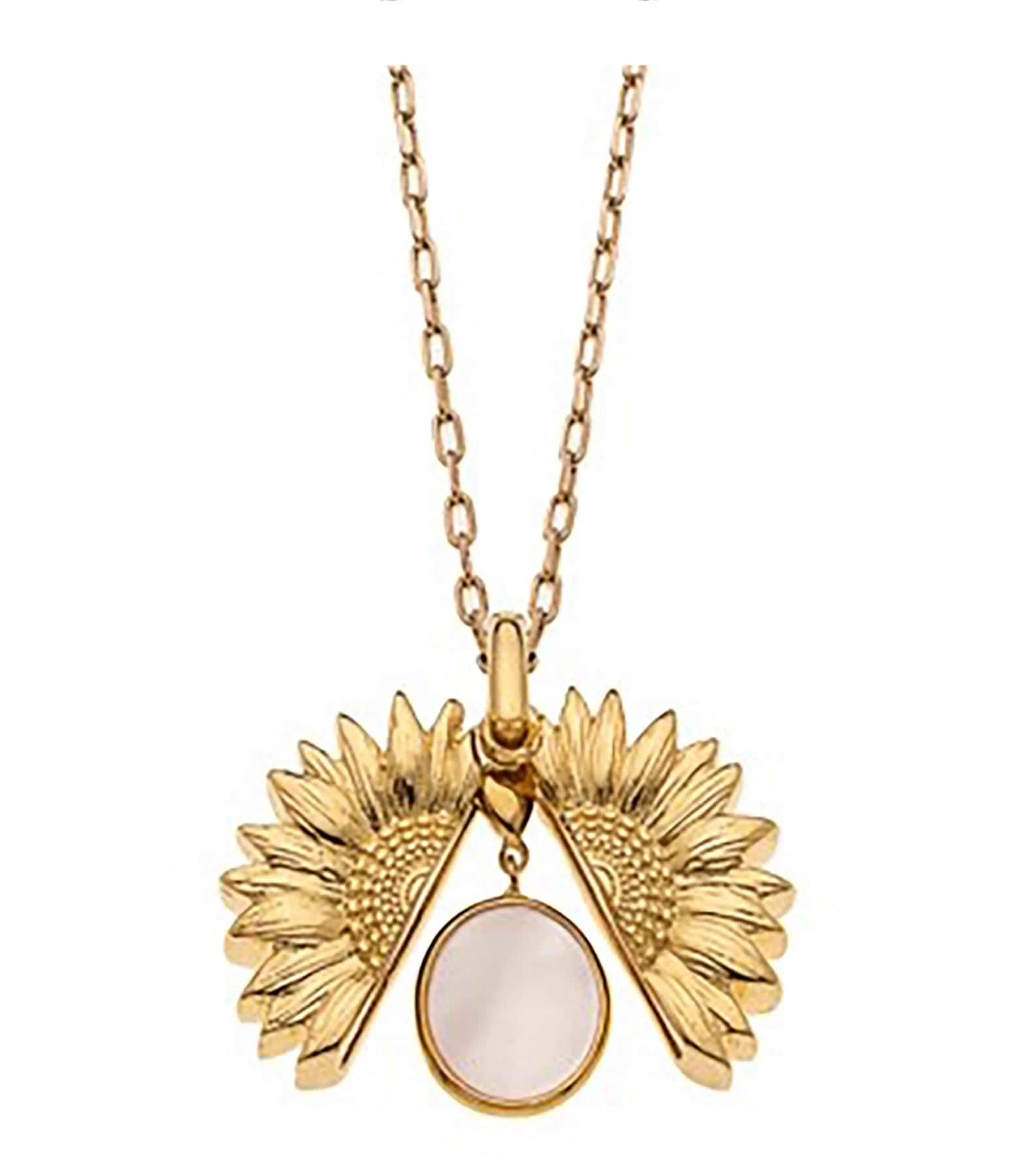 Collier chaîne plaqué or avec médaillon inspiration soleil. Médaillon avec ouverture en papillon et pierre de nacre sur bélière amovible à l’intérieur. Fermoir à ressort.