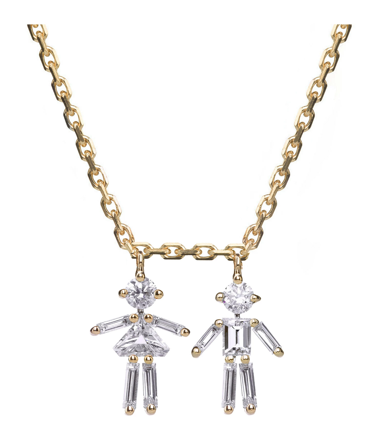 Collier sur chaîne en or jaune avec deux petits pendentifs fille et garçon sertis de 6 diamants naturels taillés. Fermoir classique à ressort avec contre-anneau.