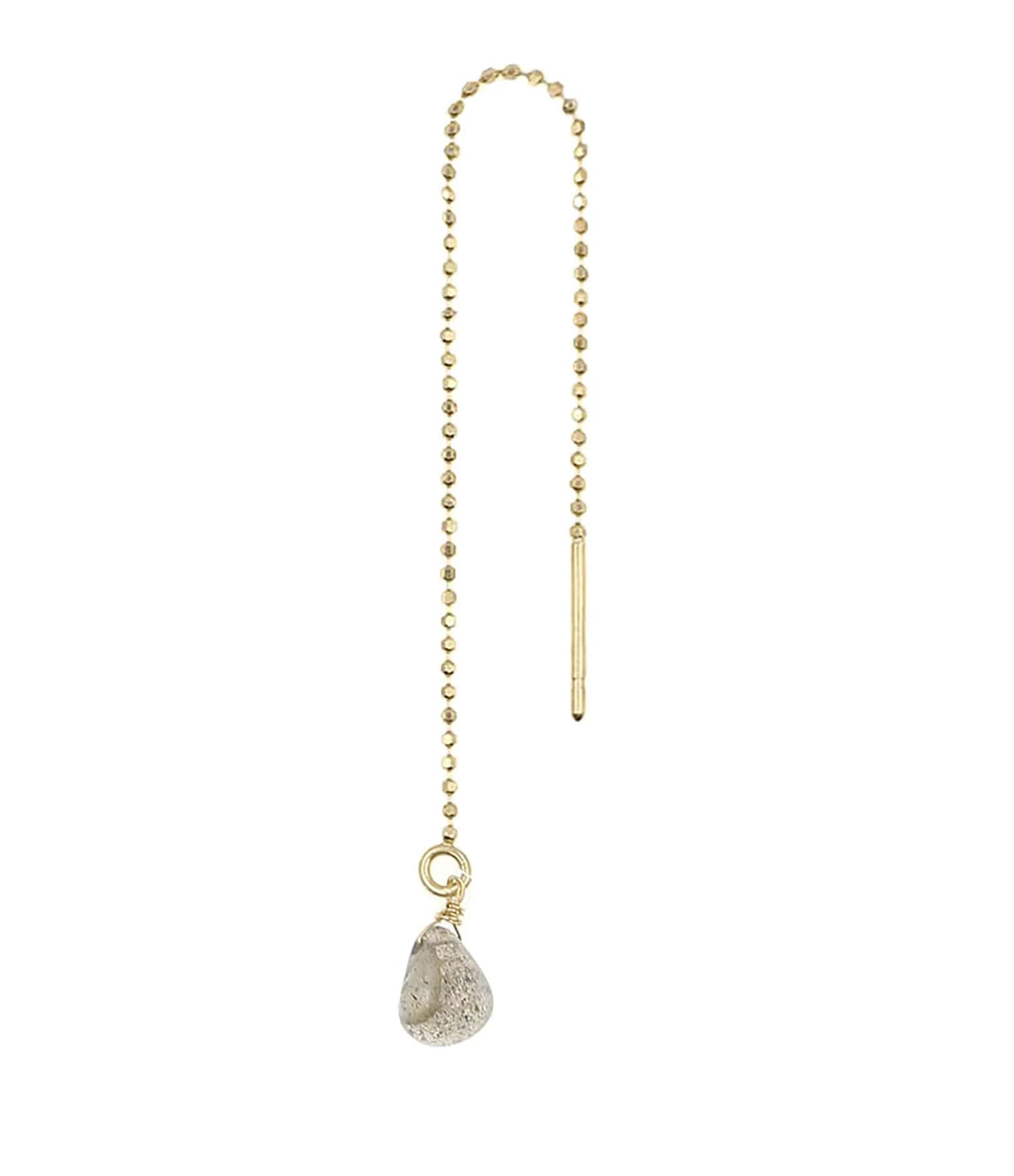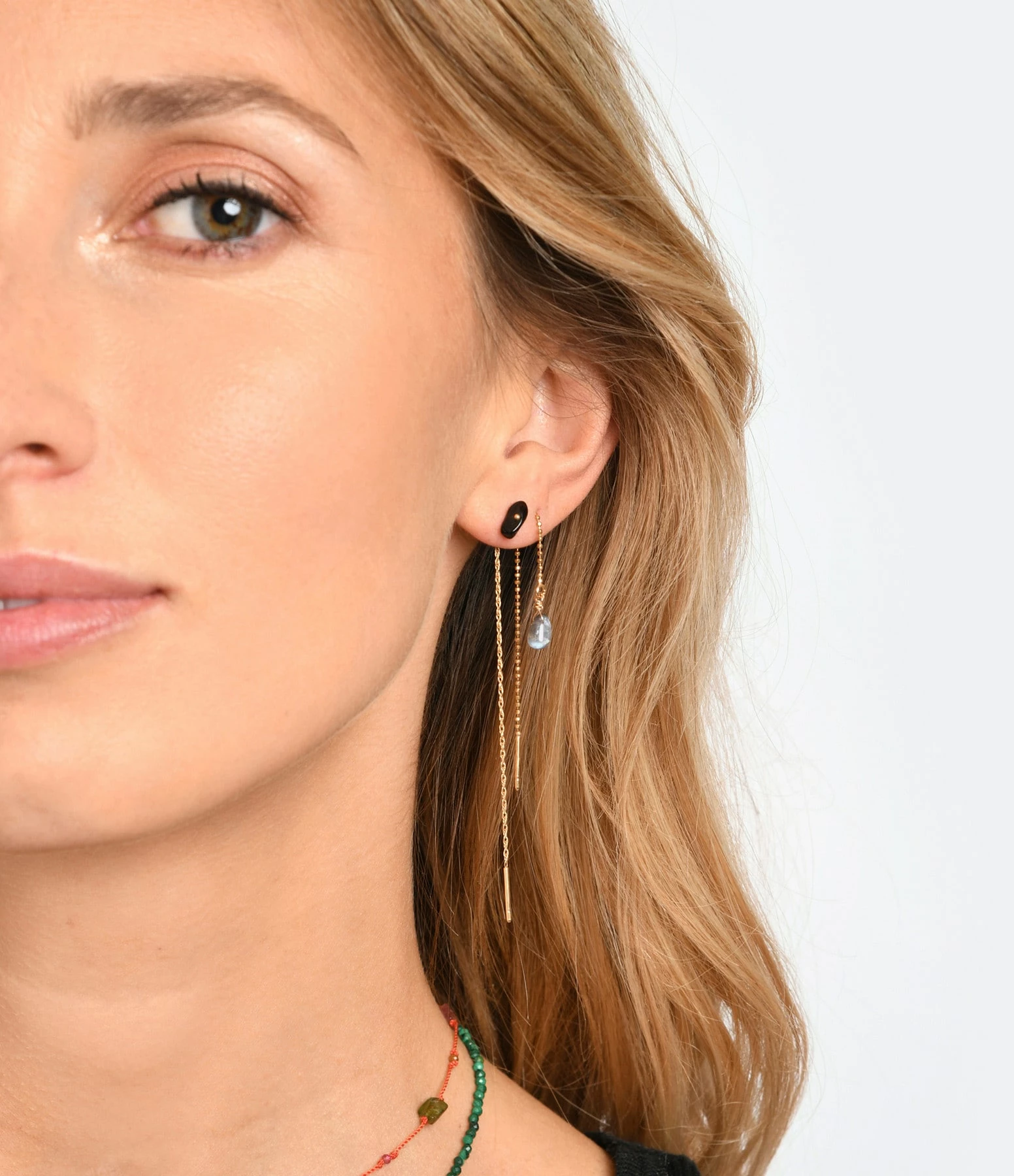 Boucle d’oreilles pendante en or jaune agrémentée d’une pierre de Labradorite. Système sans fermoir : la tige et la chaînette sont glissées délicatement dans le trou de l’oreille.