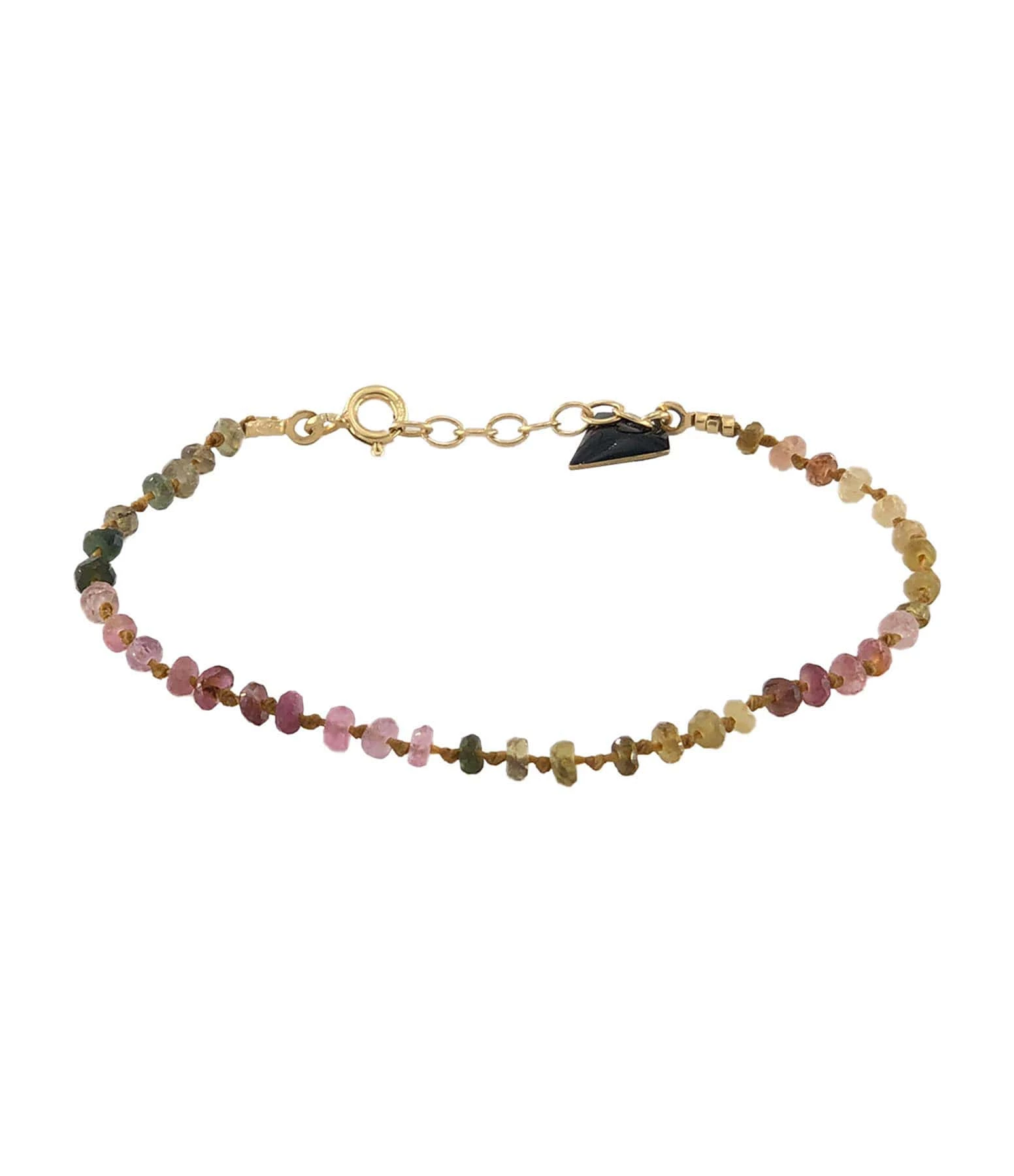 Bracelet en cordon moutarde et pierres de tourmaline. Fermoir et chaîne de réglage en argent plaqué or.