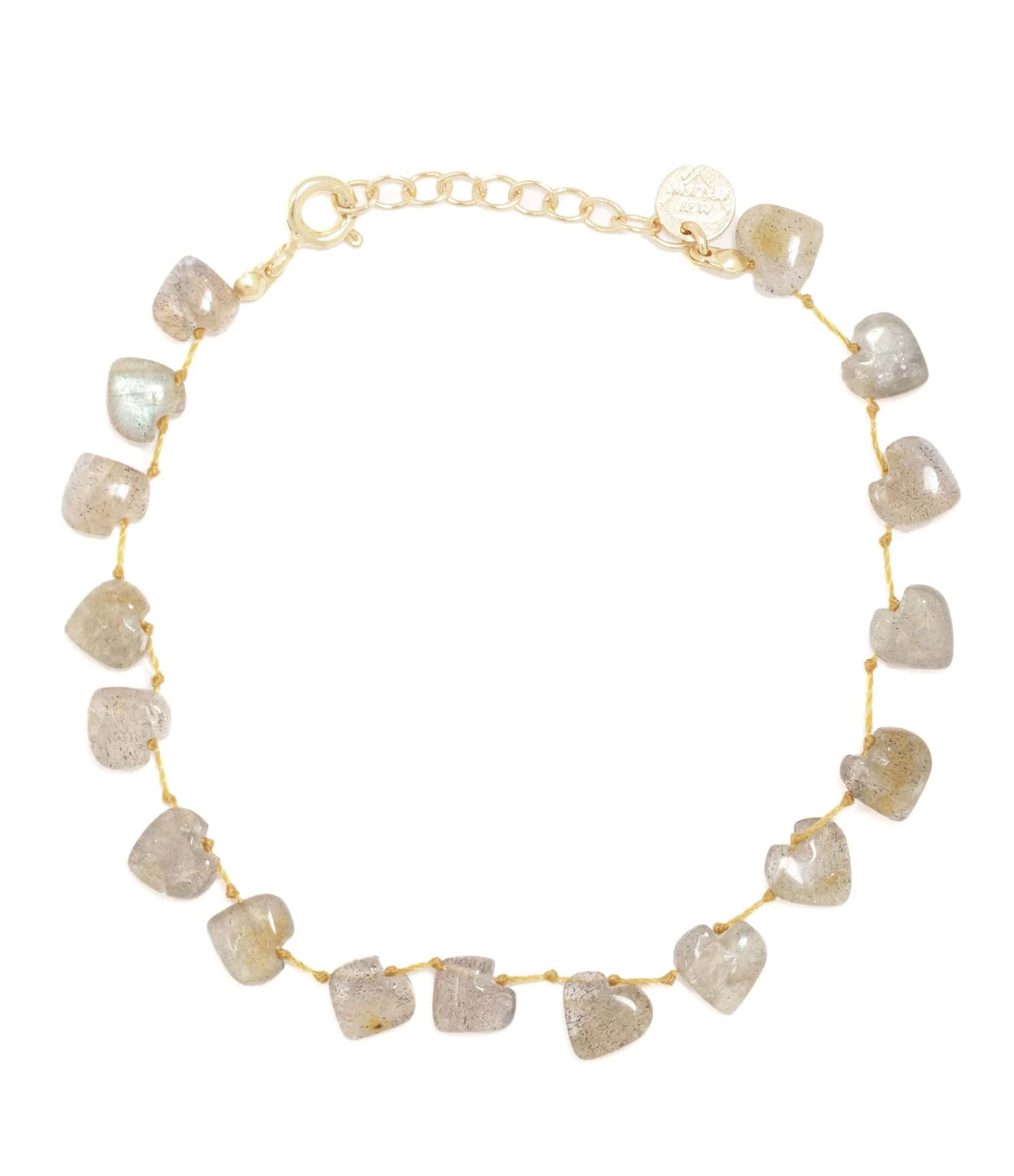 Bracelet en cordon jaune et labradorite. Fermoir et chaîne de réglage en argent plaqué or.