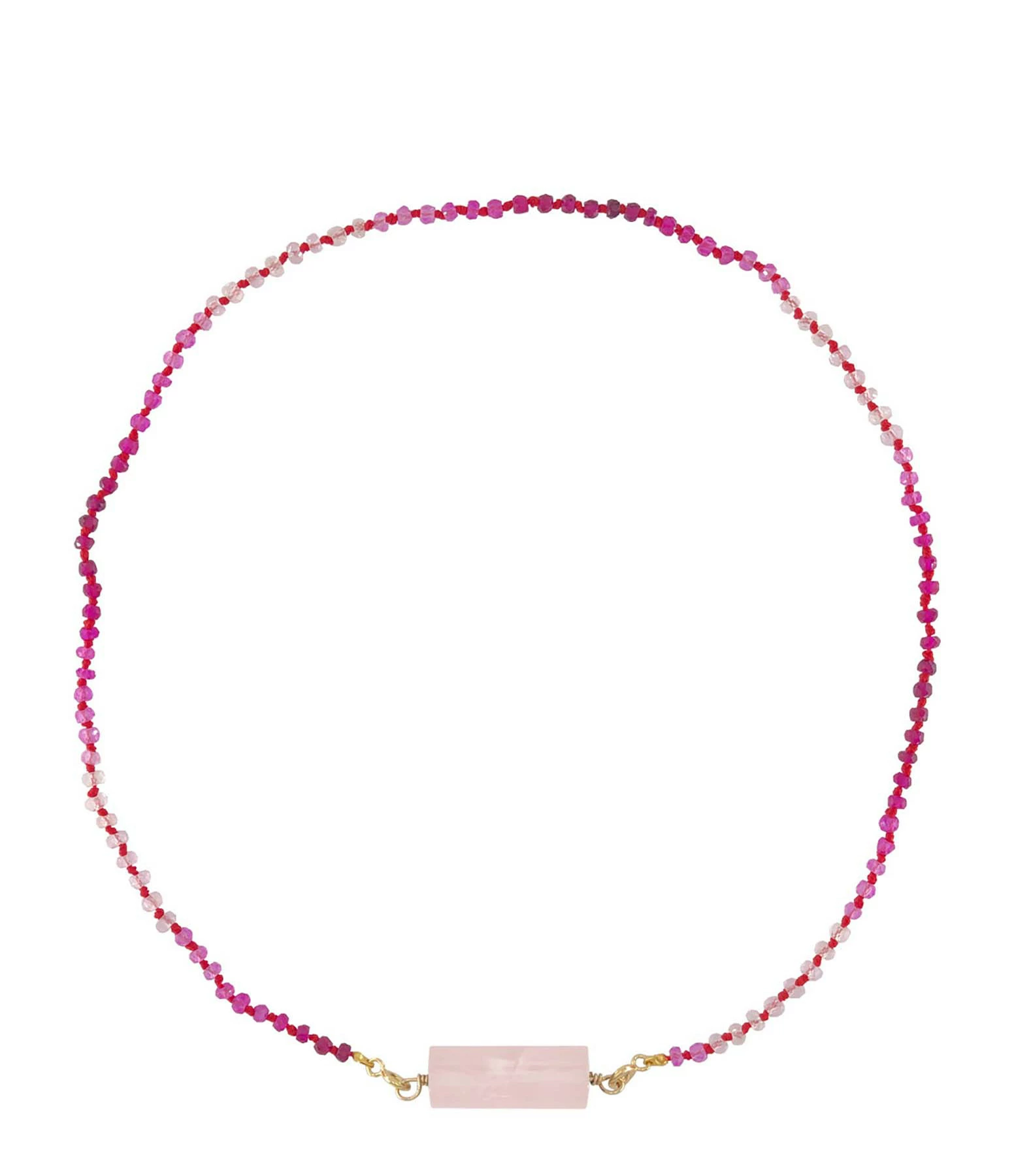 Collier à cordon rose et rubis. Pendentif Rolla Bolla en quartz attaché par deux fermoirs en argent plaqué or.
