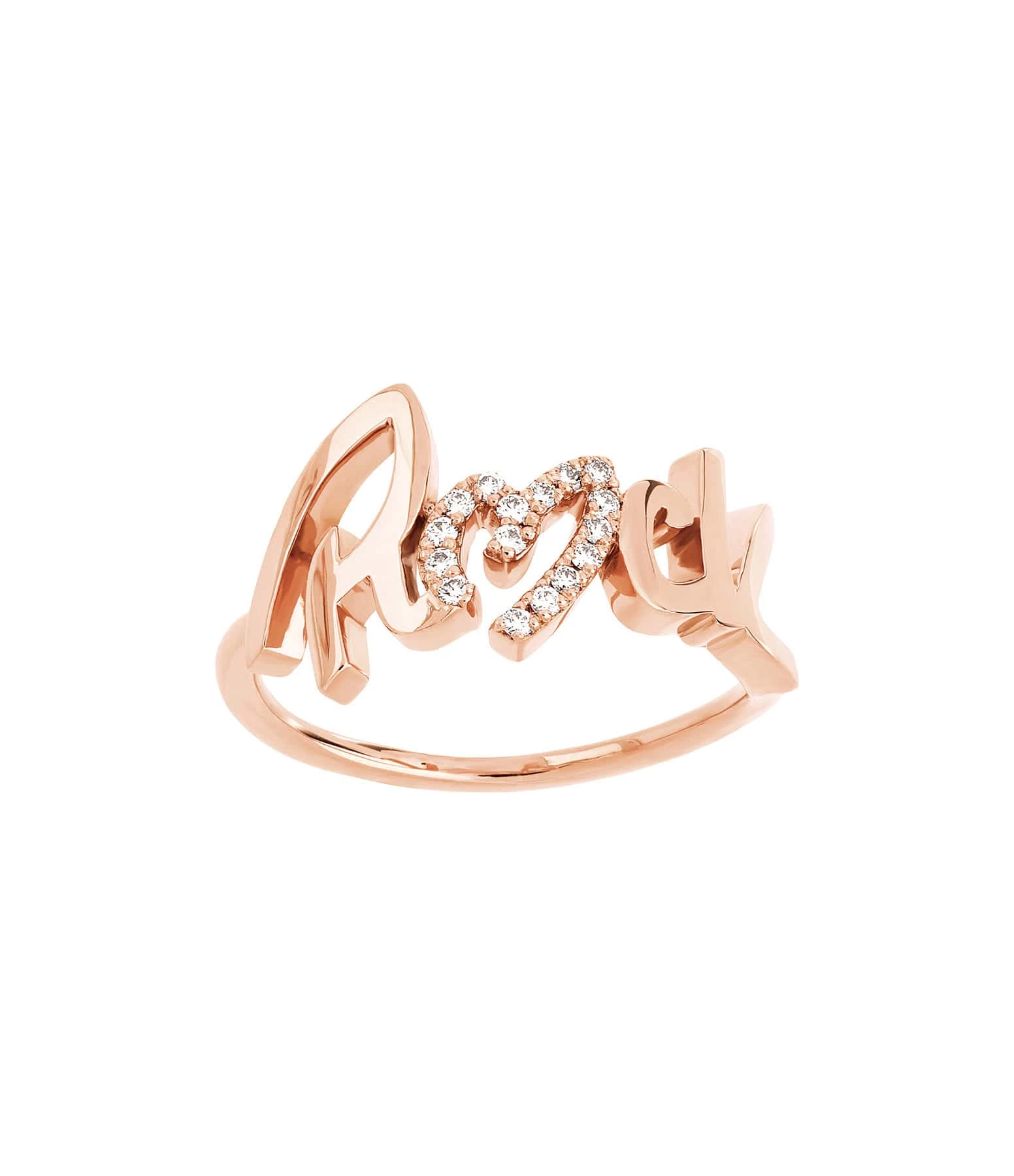 Bague en or rose avec inscription « Rock » sertie de diamants ronds sur le « O ».