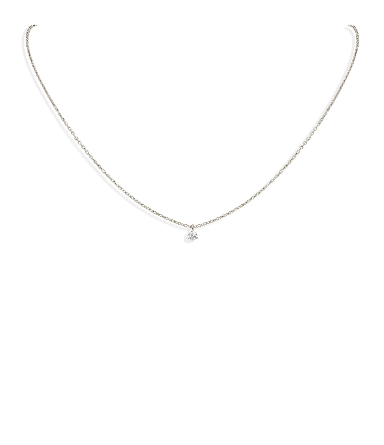 Collier en or blanc avec un diamant rond serti en pendentif. Fermoir à ressort avec chaînette de réglage.