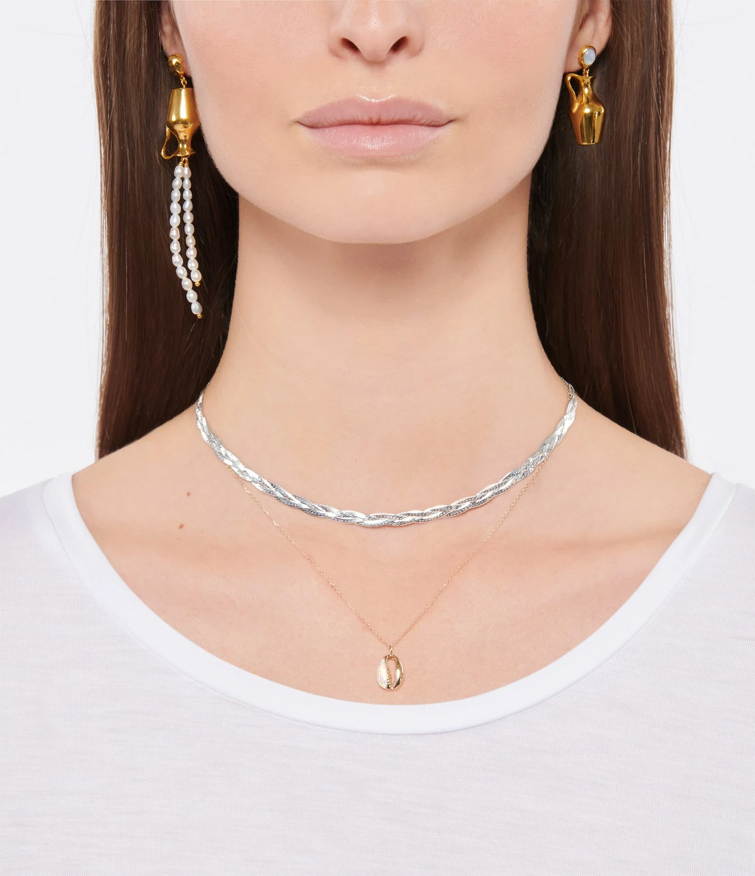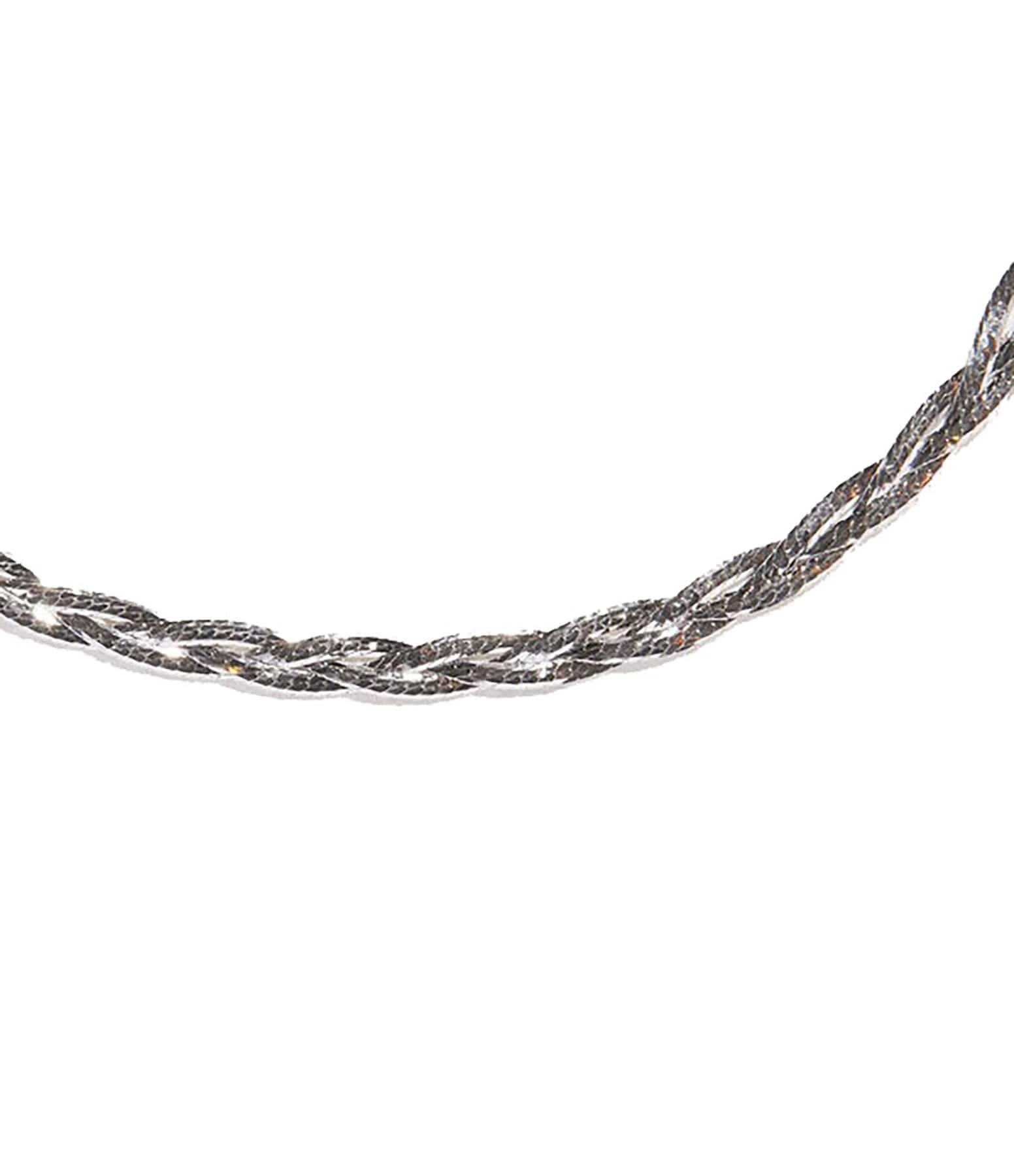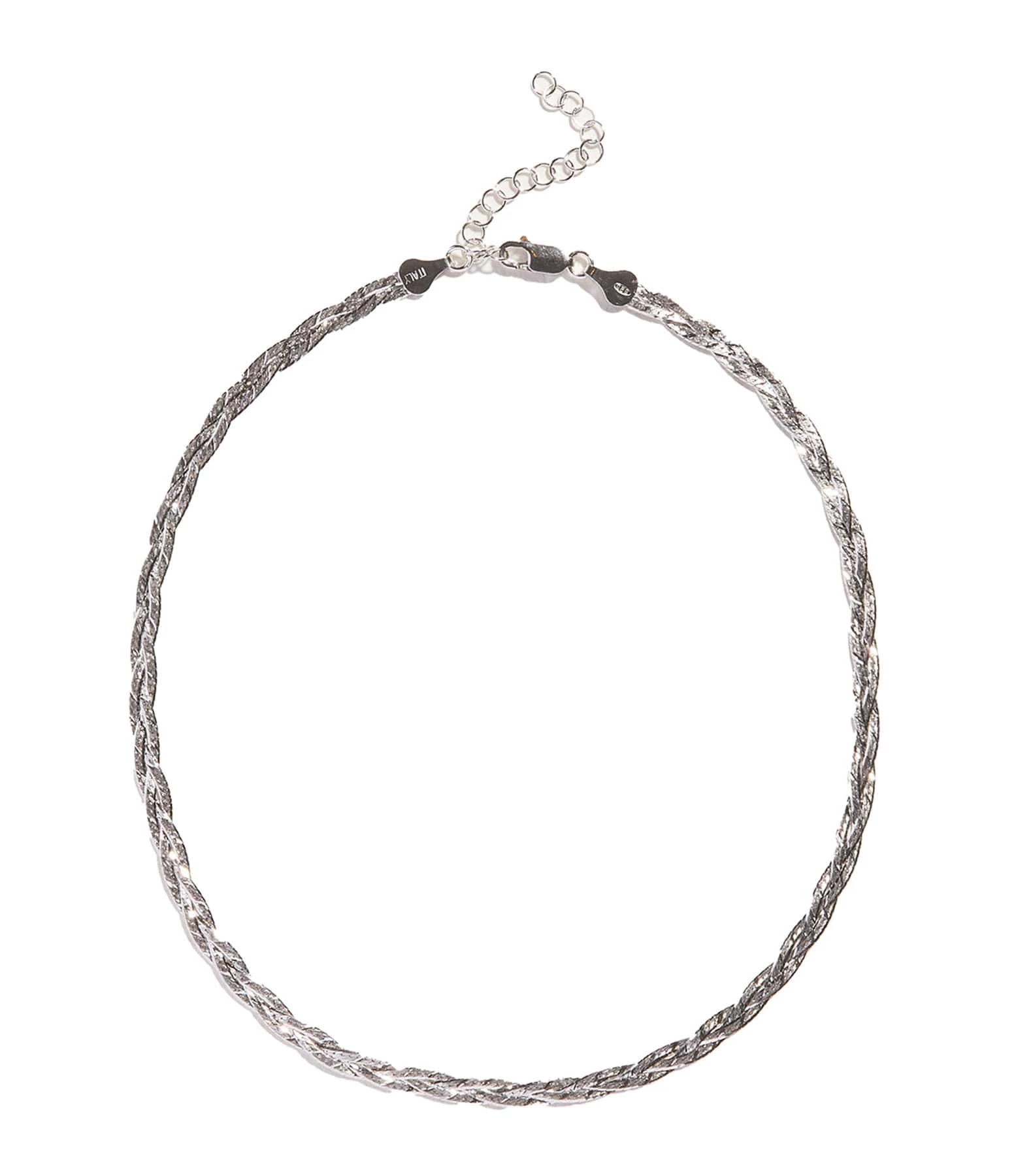 Collier en chaîne chevron tressée en argent, un côté mat, un côté brillant. Se positionne parfaitement le long de la clavicule. Chaînette de réglage de 5 cm.