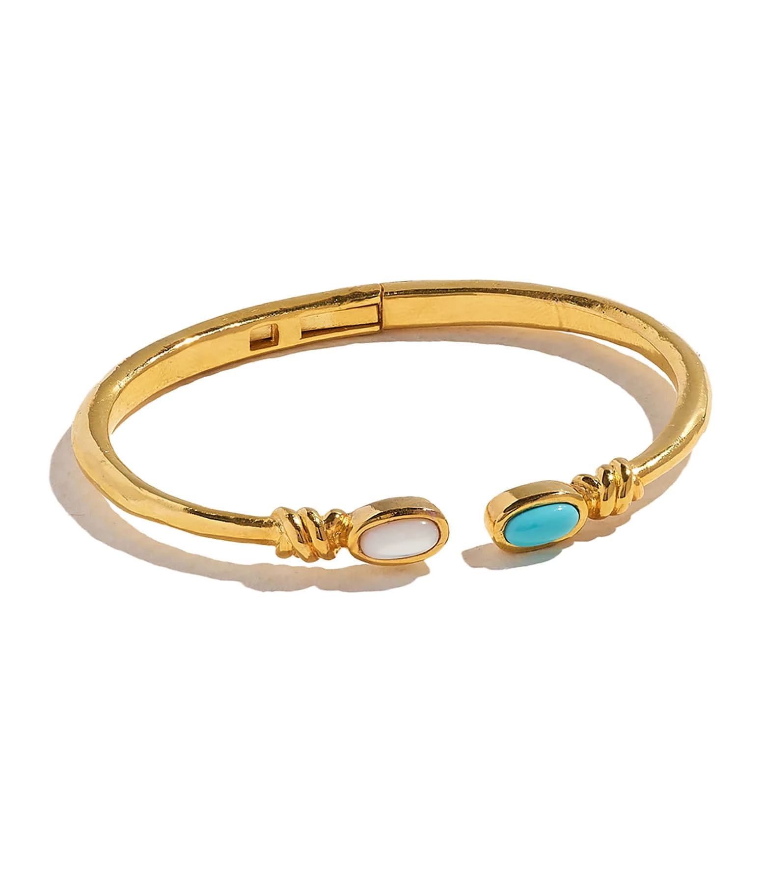 Jonc en laiton doré, serti d’une perle d’eau douce et d’une turquoise aux extrémités. Système d’ouverture par articulation.
