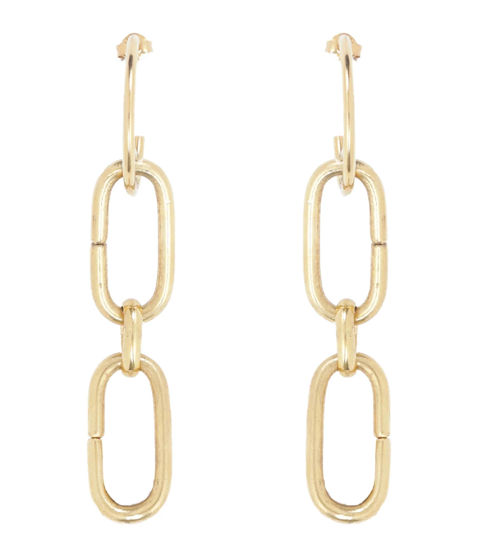 Boucles d’oreilles pendantes en laiton doré. Maillons plats et ovales. Fermoir poussette.