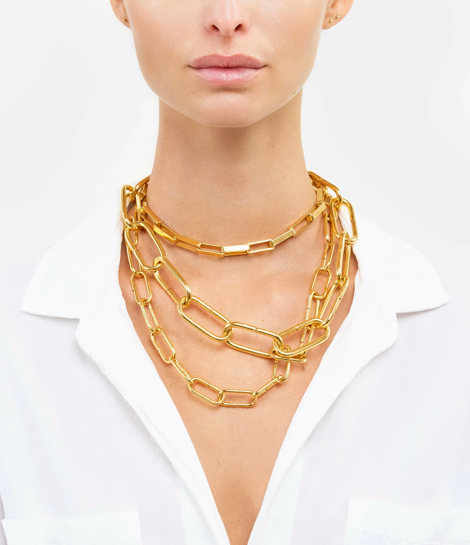 Collier ras de cou en laiton doré, triple chaîne, donnez l’illusion de porter une multitude de bijoux en en portant qu’un. Fermoir à cliquet ovale.