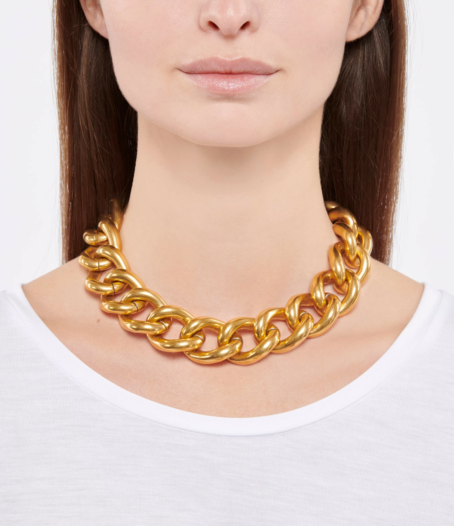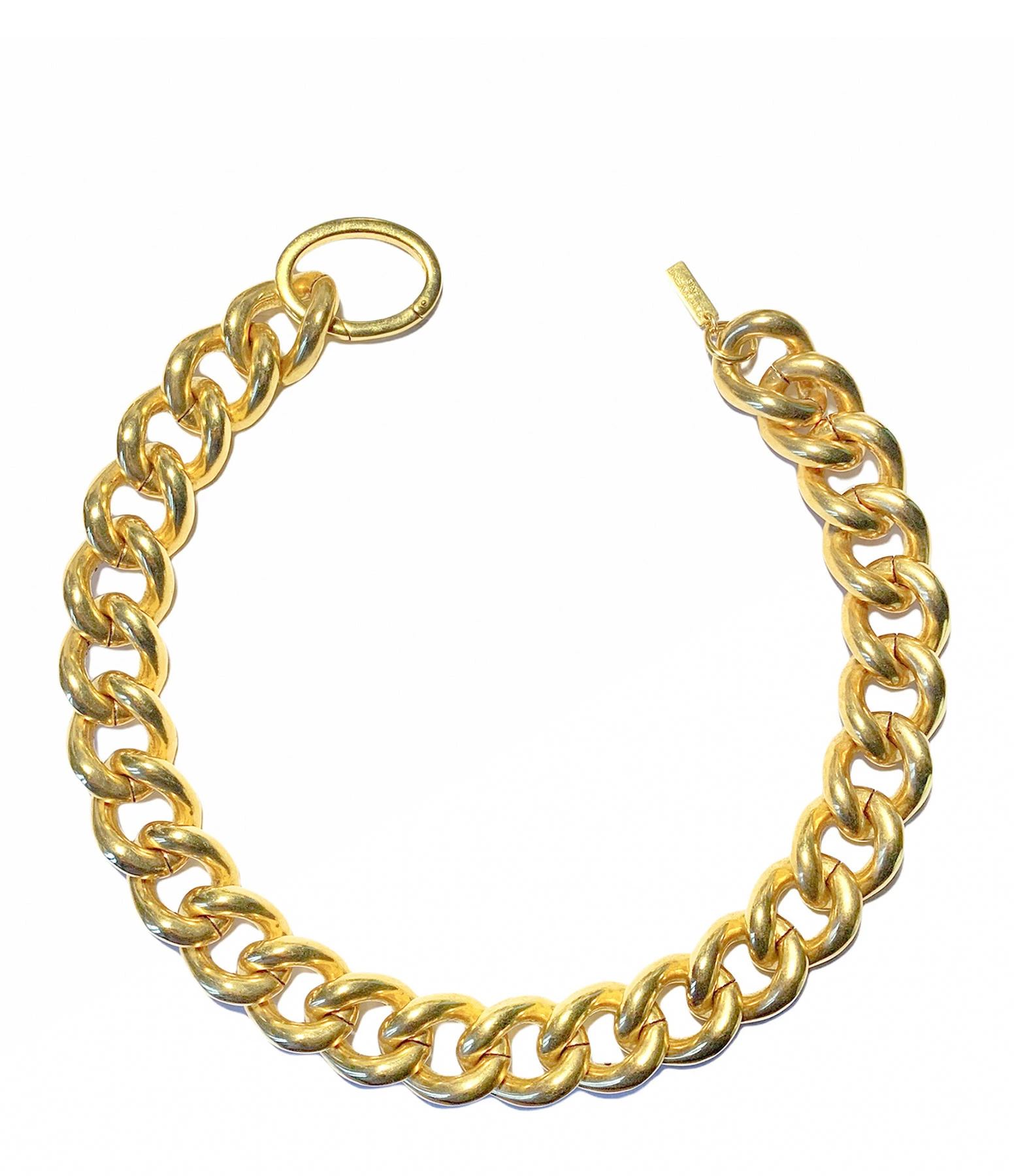 Collier en laiton doré, maillons imposants et plats. Fermoir à bascule.