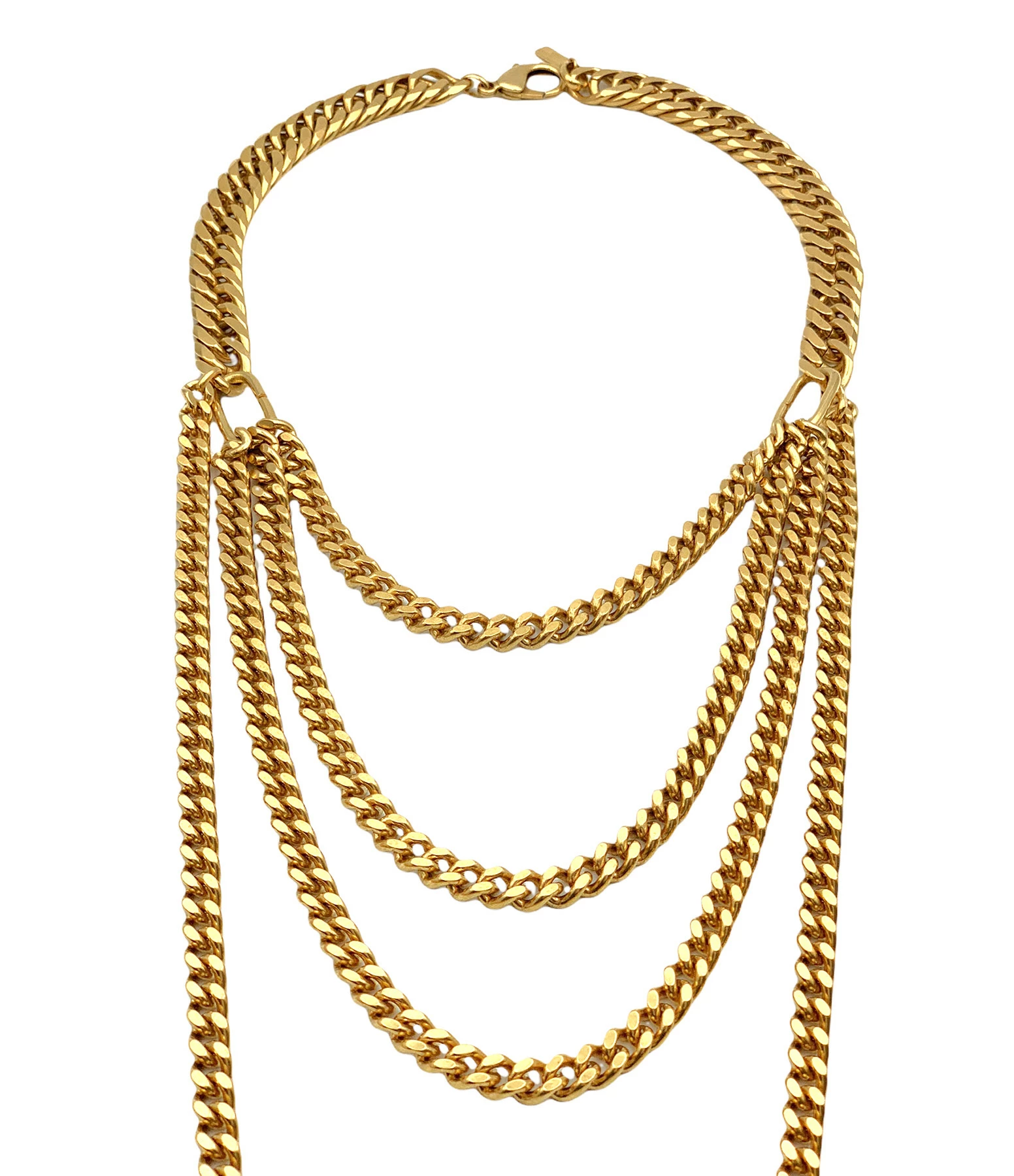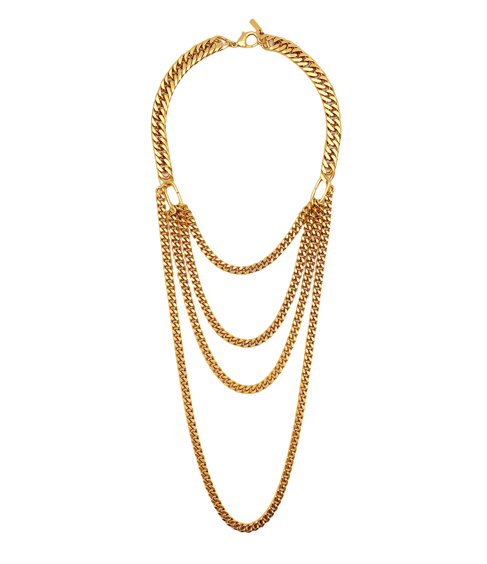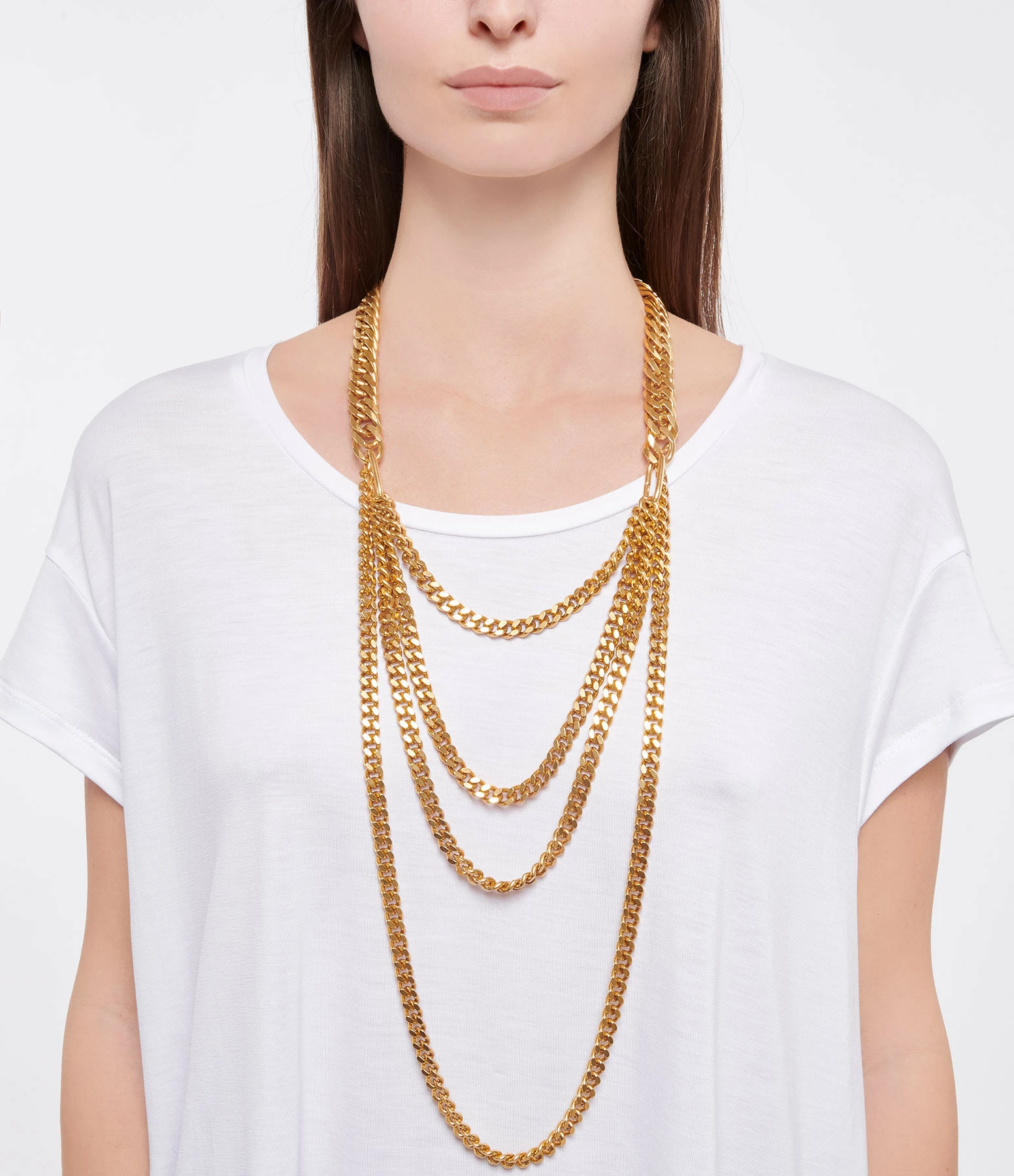 Collier long en laiton doré. Maillons plats. Une chaîne à maillons imposants reliée à quatre chaînes par deux anneaux. Fermoir à ressort.