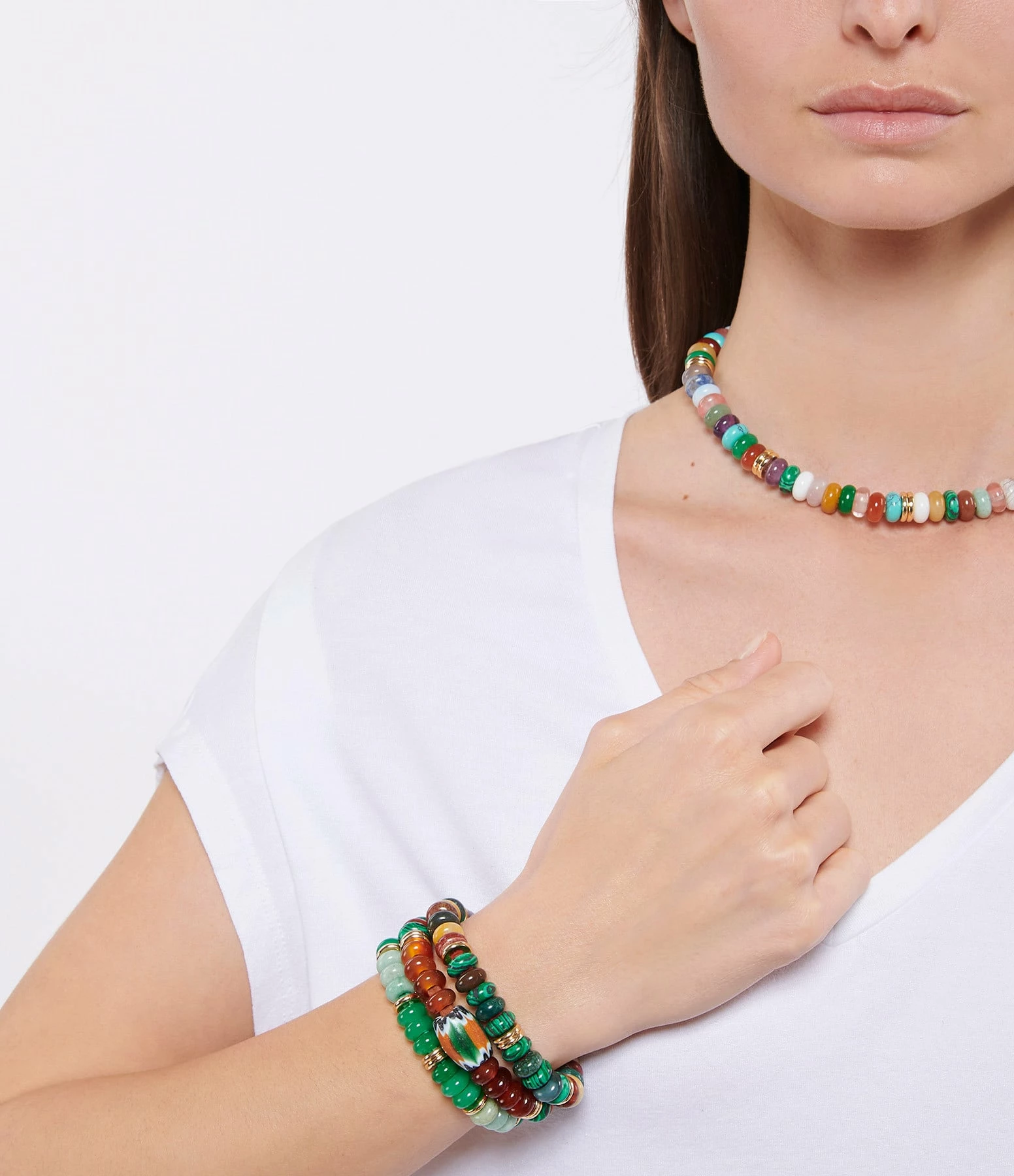 Bracelet en perles sur cordon en daim avec fermoir ajustable en plaqué or, dans les tons bleus et verts.