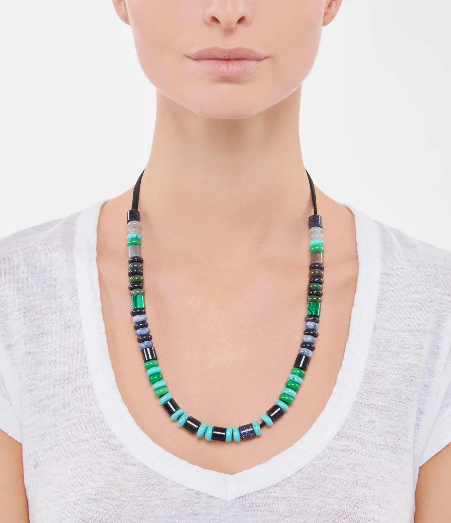 Collier en perles sur cordon en daim avec fermoir ajustable en plaqué or, dans les tons verts, bleus et marrons.