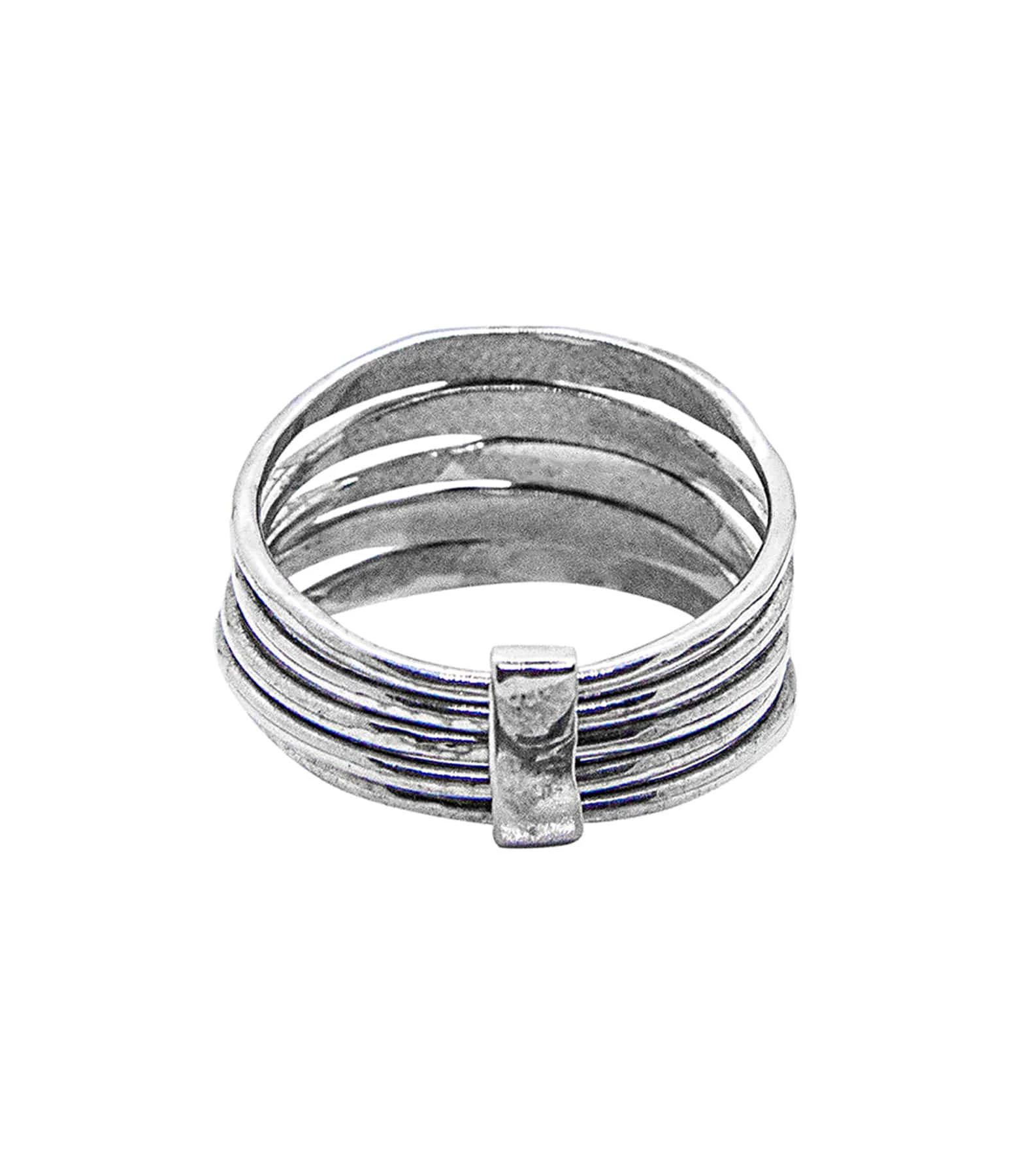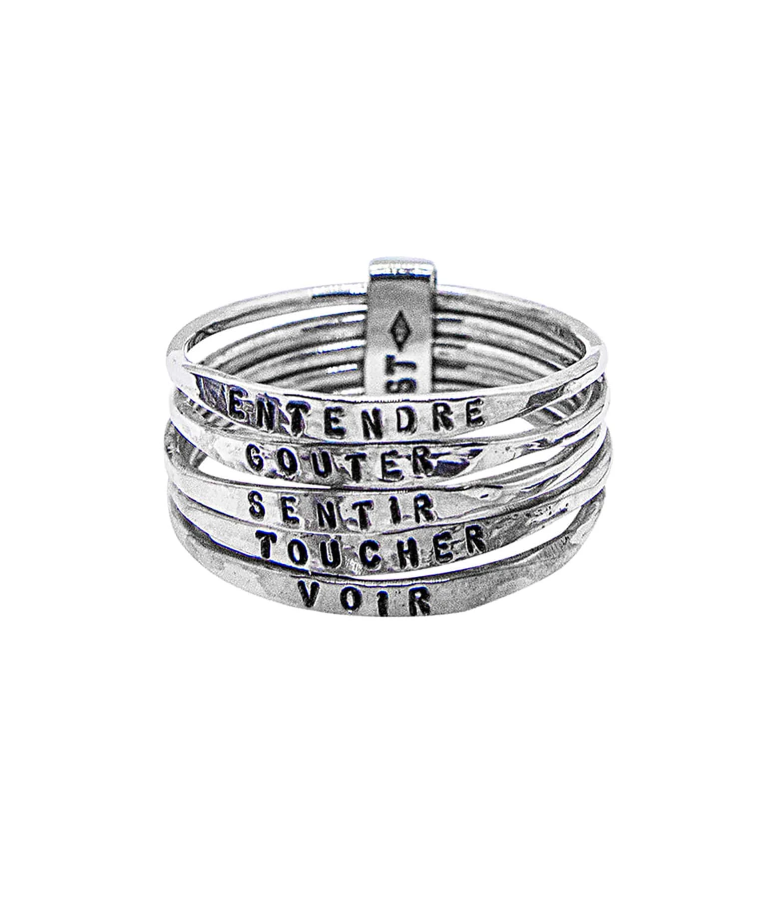 Bague composée de cinq anneaux fins en argent gravé « ENTENDRE », « GOÛTER », « VOIR », « SENTIR », et « TOUCHER ».