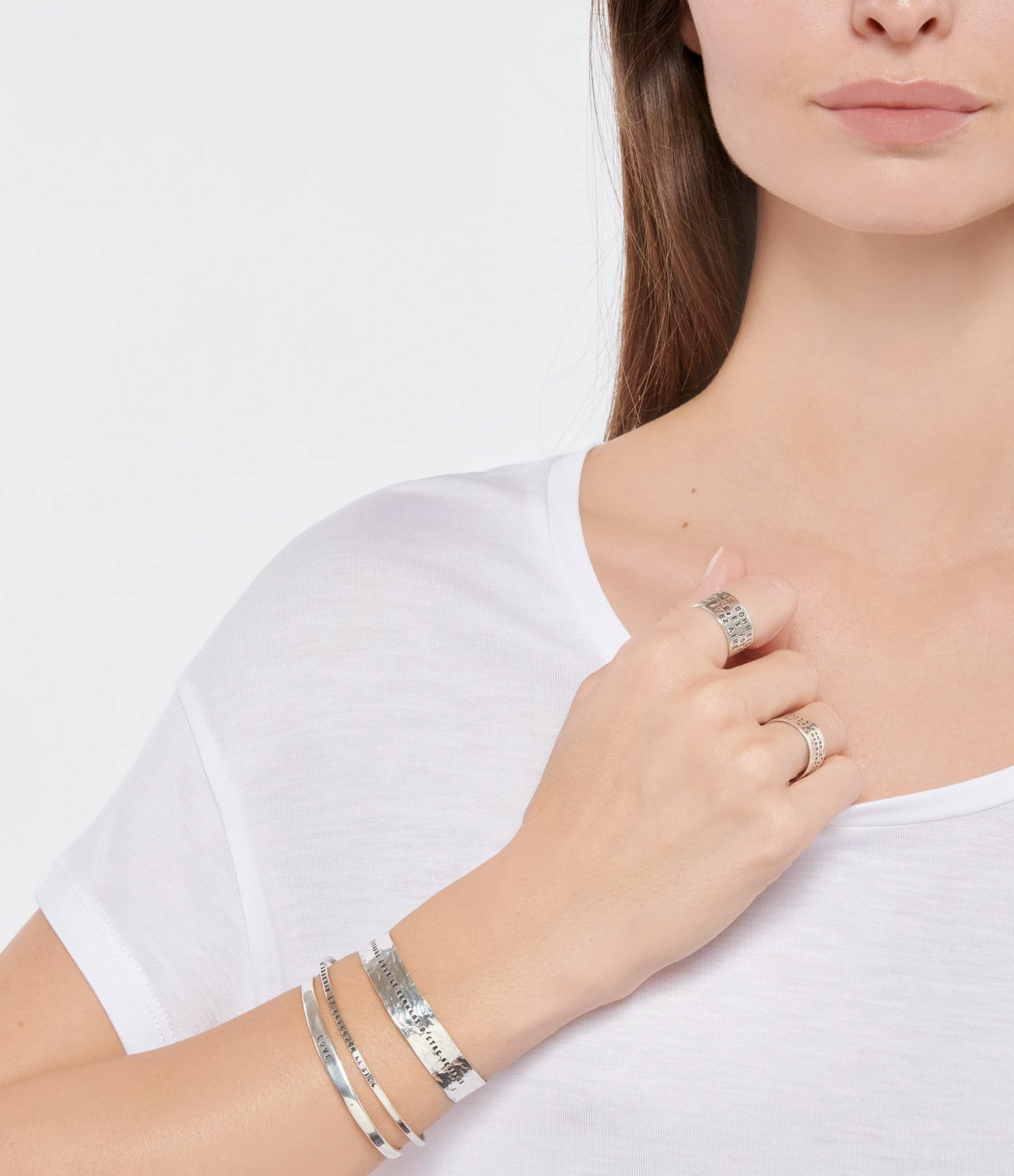 Conseil d’entretien : Afin de conserver longtemps la patine noire dans la gravure de votre bijou, évitez les contacts avec l’eau les premières semaines. L’argent est une matière naturelle qui se patine avec le temps, sa couleur évoluera selon l’acidité de votre peau et les conditions atmosphériques. Utilisez un chiffon doux et un produit adapté pour le nettoyer en évitant d’effacer la patine, rincer abondamment, puis essuyez.