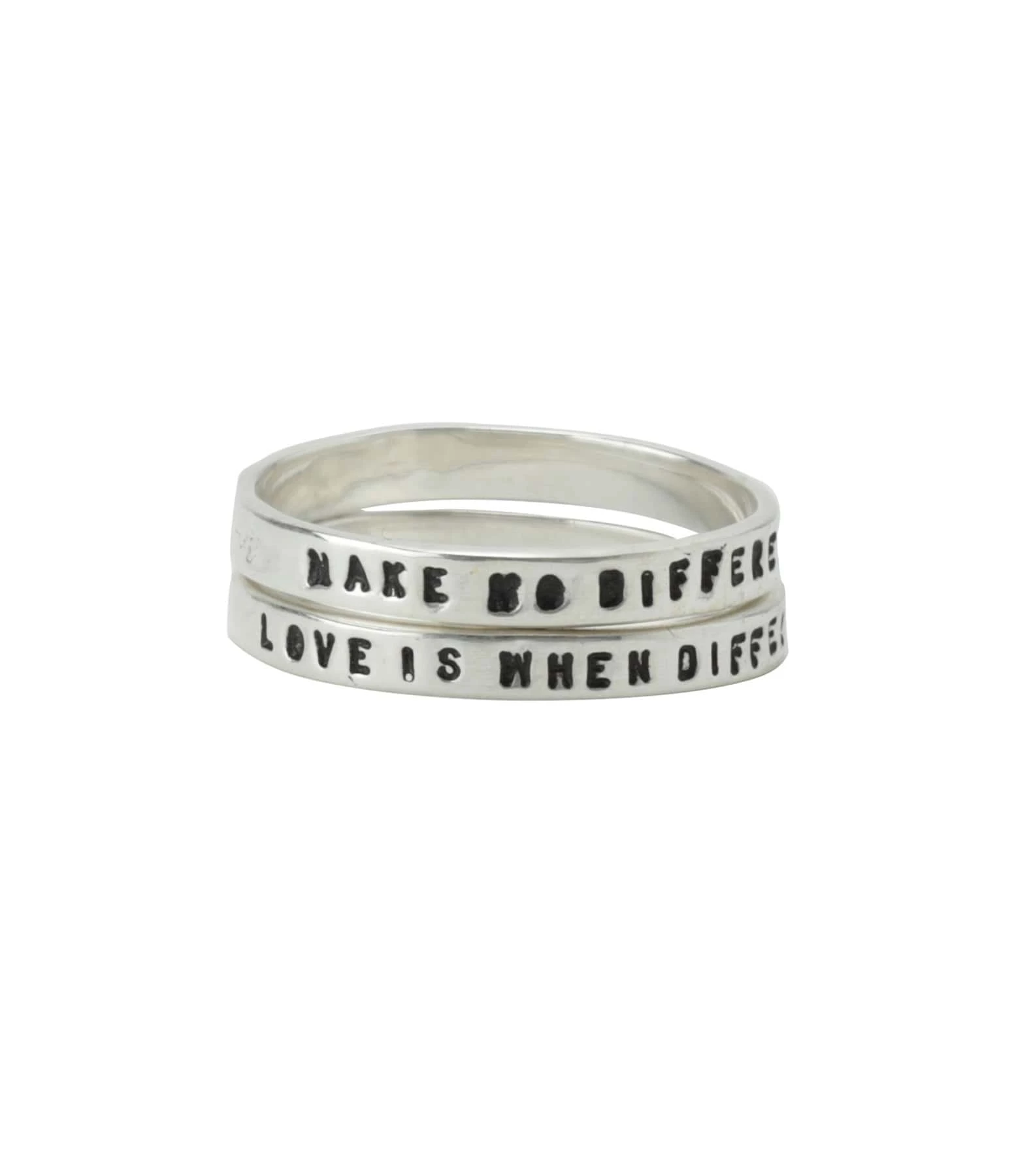 Deux bagues en argent avec gravure « Love is when differences » et « Make no difference ».