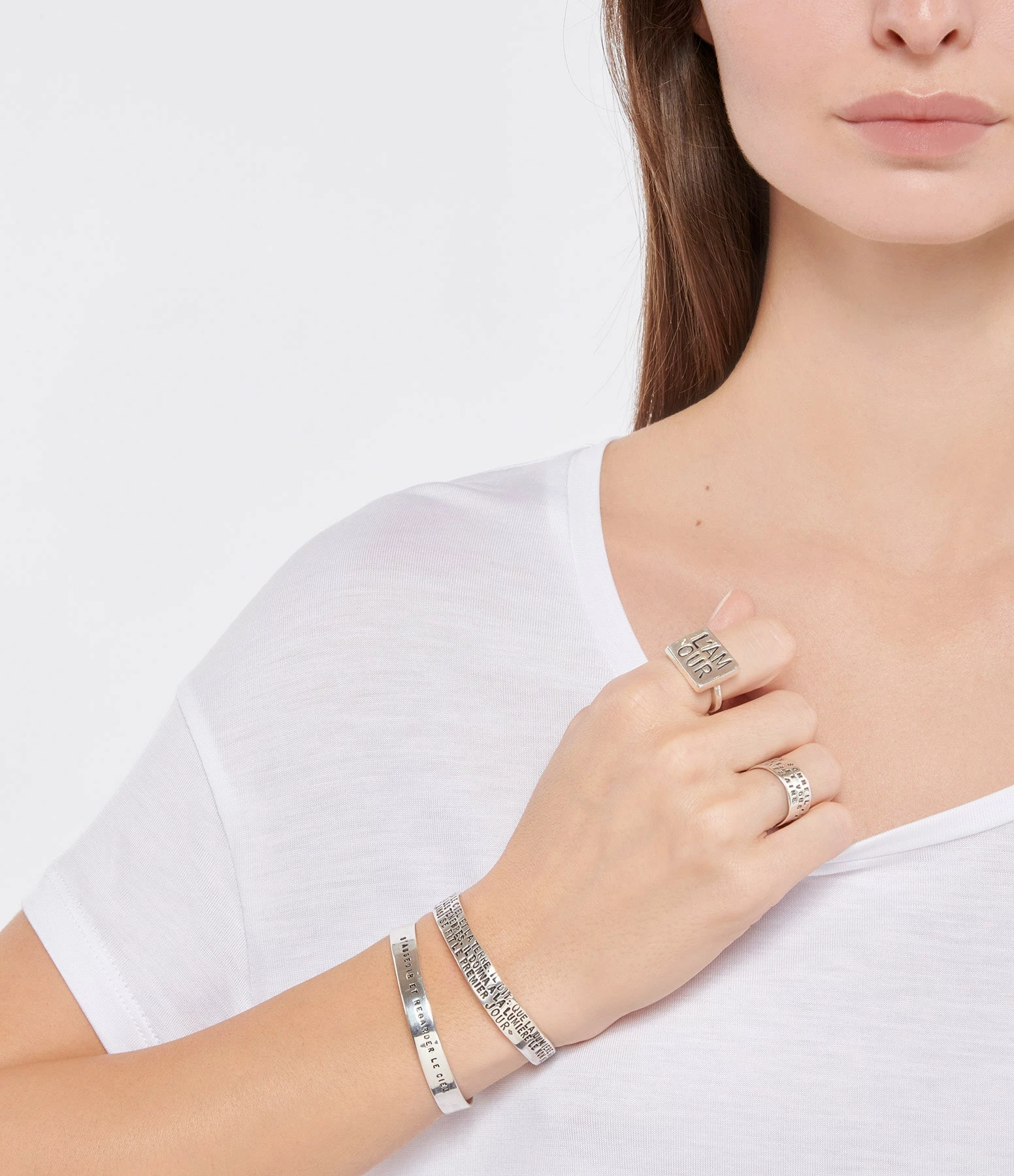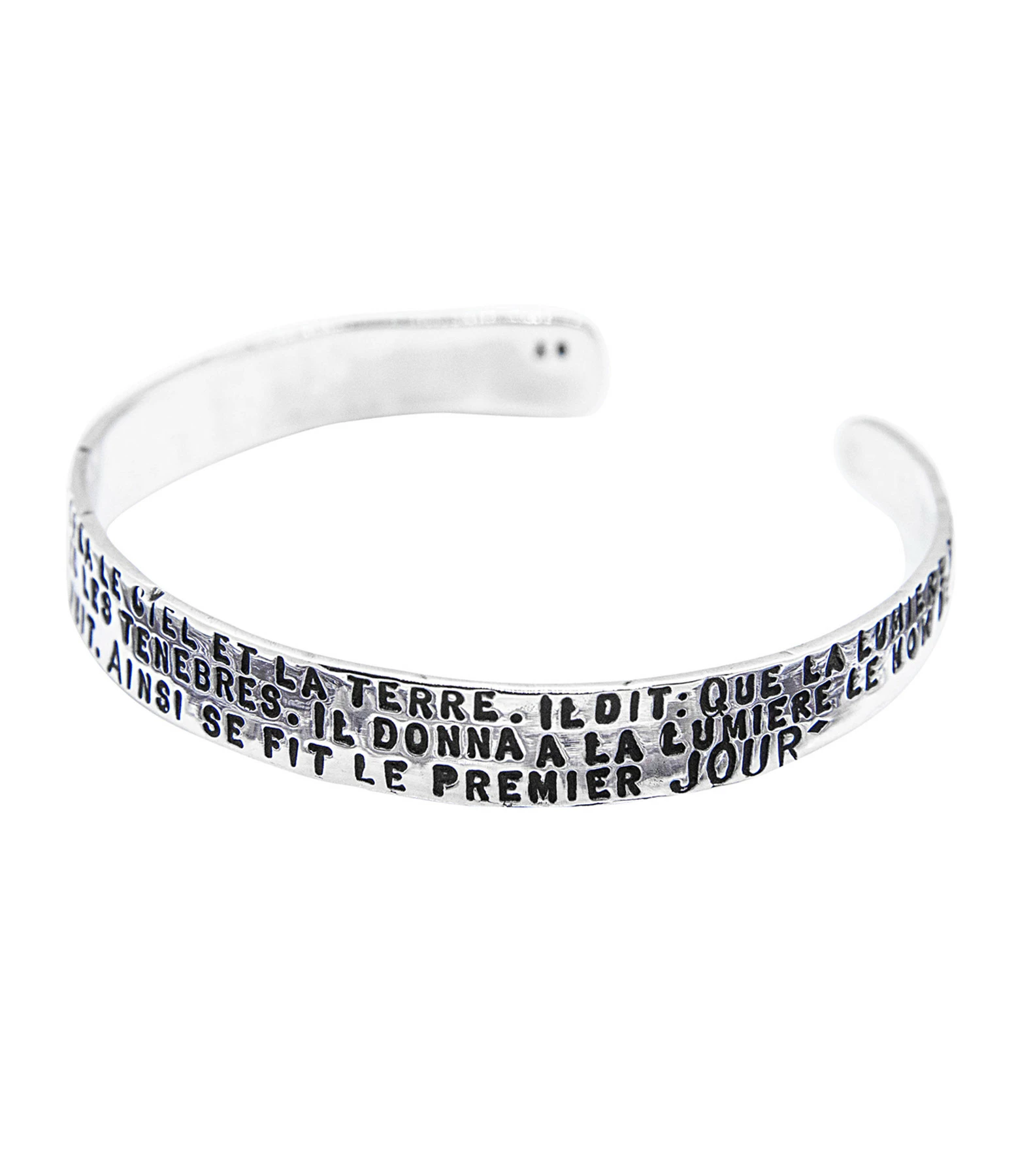 Bracelet jonc en argent avec gravure « Au commencement Dieu créa le ciel et la terre. Il dit : Que la lumière soit faite. Il sépara la lumière d’avec les ténèbres. Il donna à la lumière la nom de jour et aux ténèbres le nom de la nuit. Ainsi se fit le premier jour ».