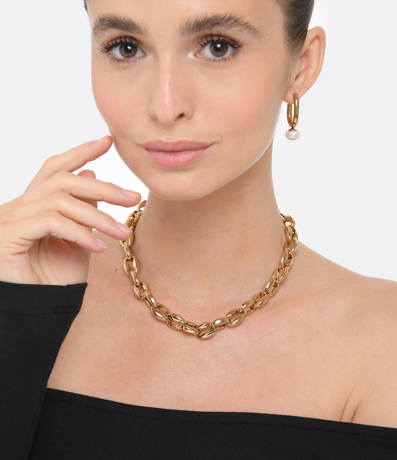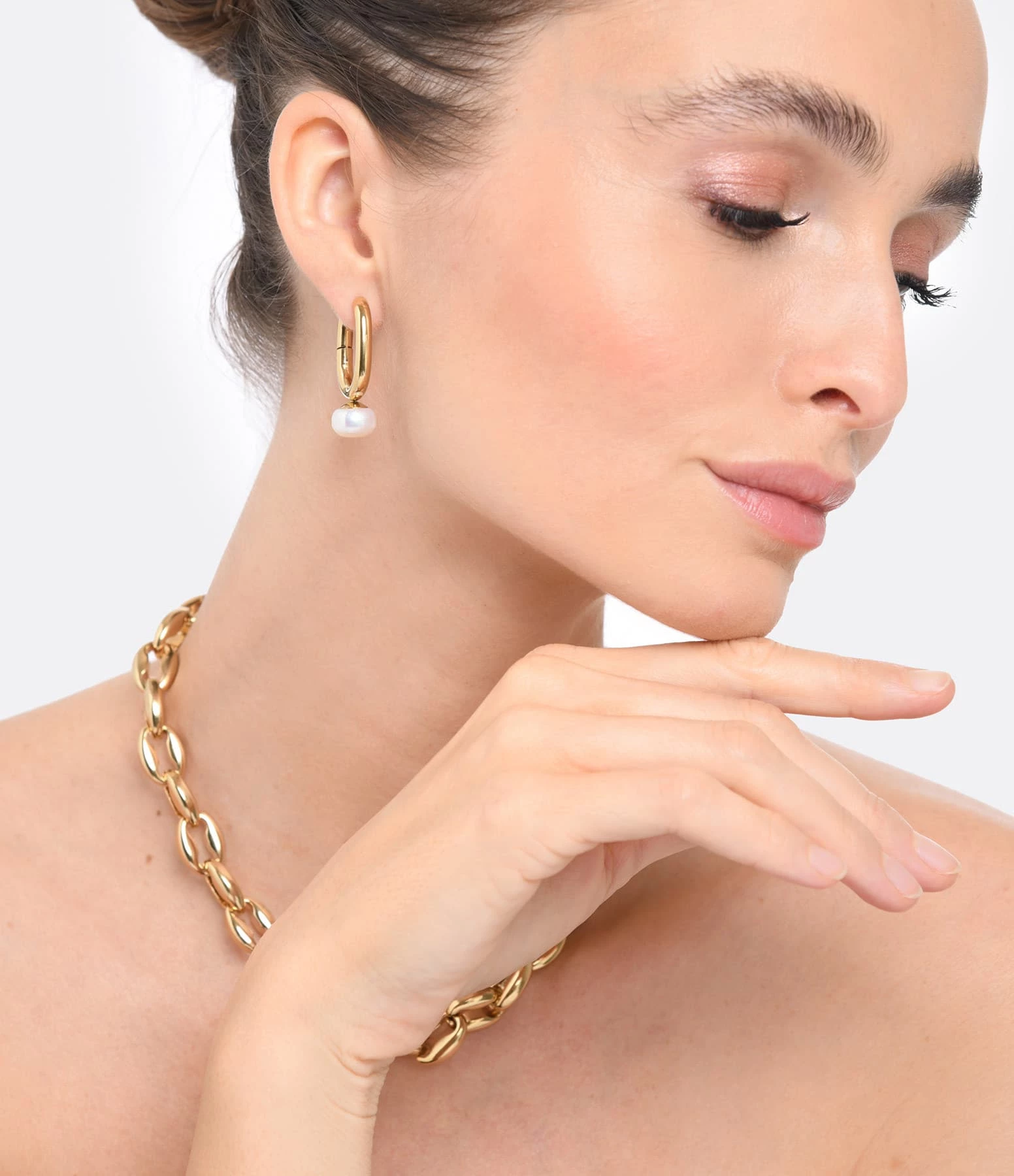Boucles d’oreilles créoles dorées avec perle d’eau douce. Fermoir russe. Vendues à la paire.