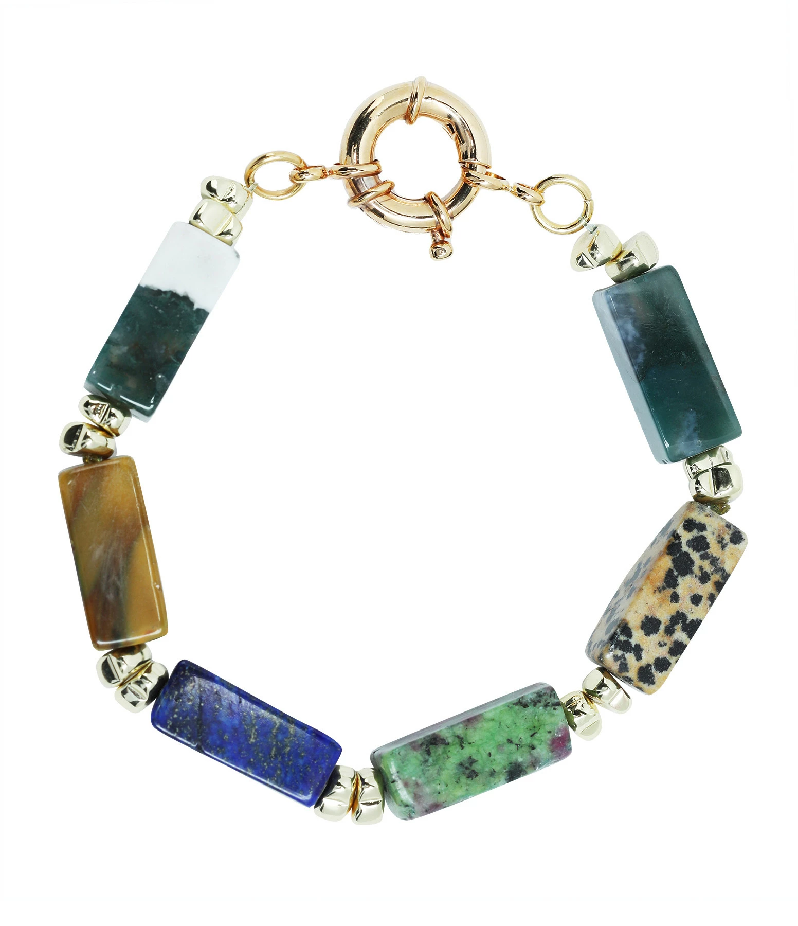 Bracelet en perles rectangulaires de différentes pierres. Fermoir classique à ressort.
