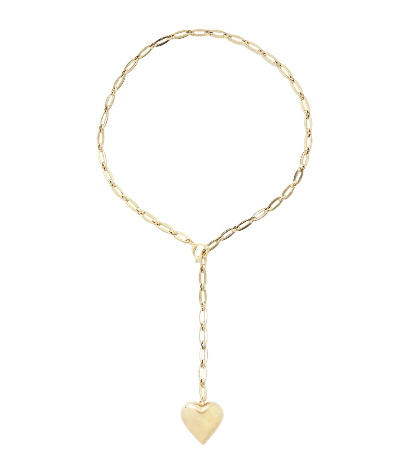 Collier forme Y en argent doré, large chaîne en maille et pendentif cœur. À porter en Y ou en sautoir classique. Fermoir à ressort.