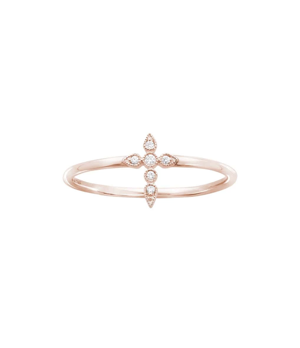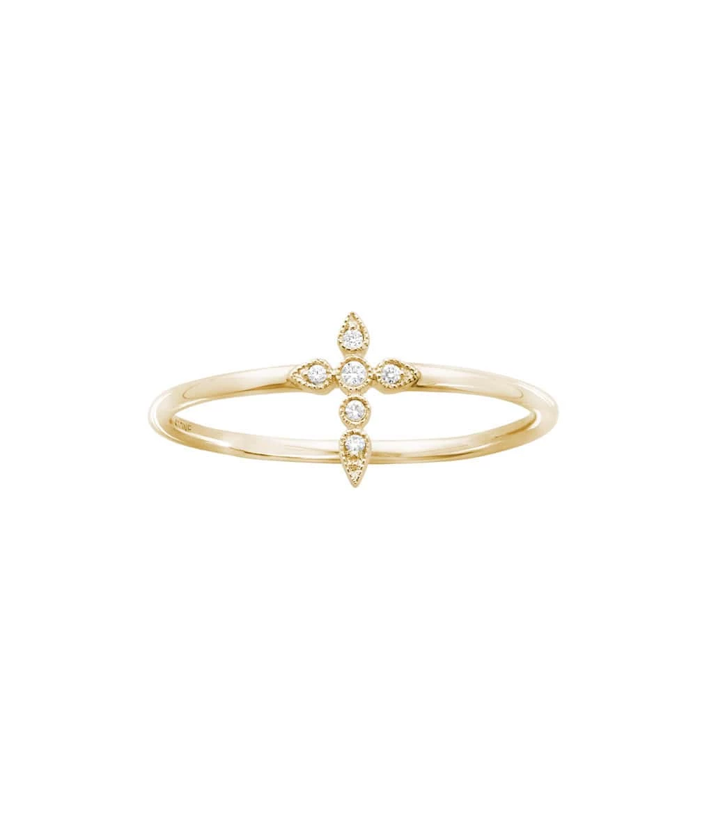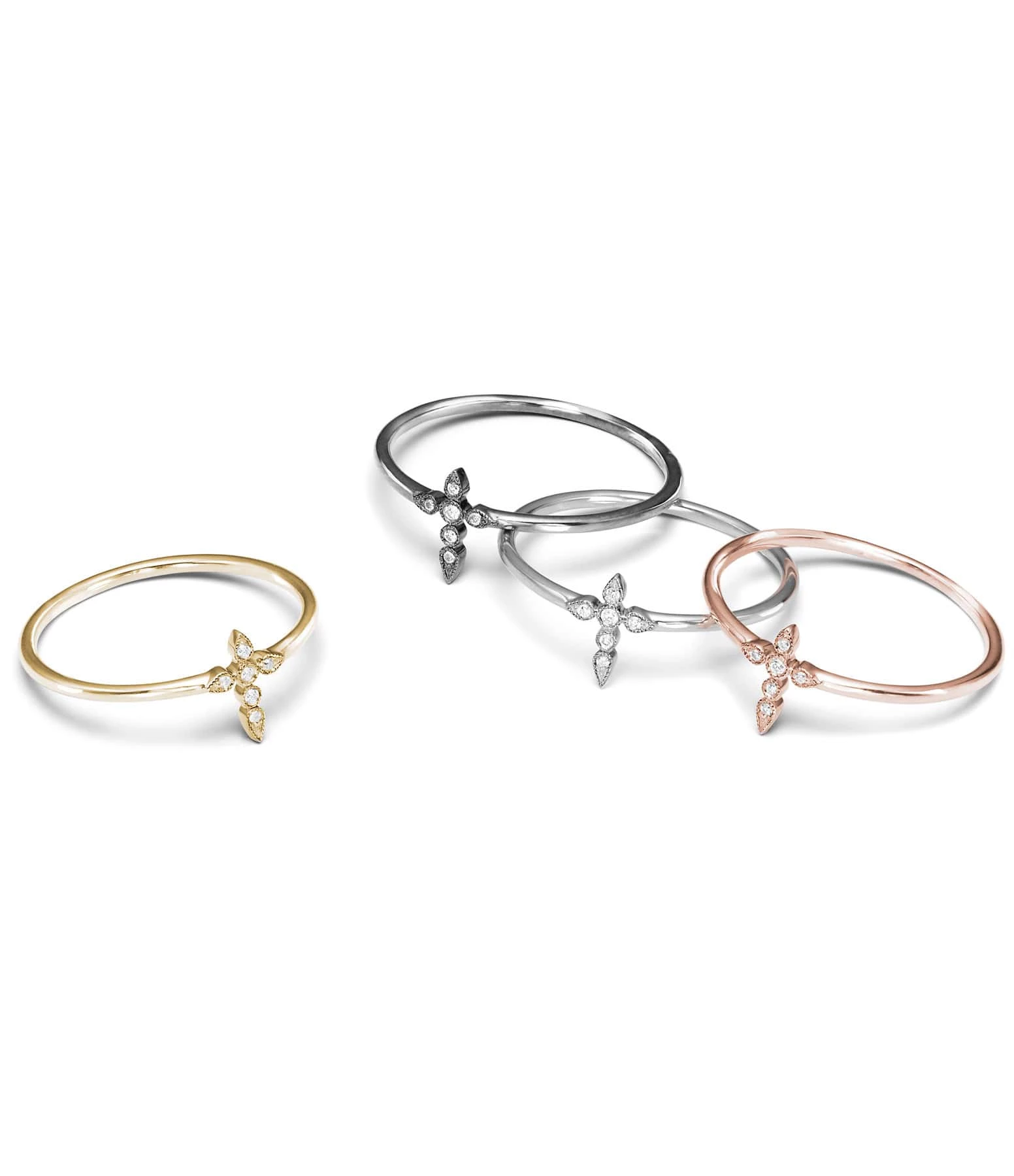 Bague en or jaune, rose, noir ou blanc, avec petite croix sertie de six diamants.