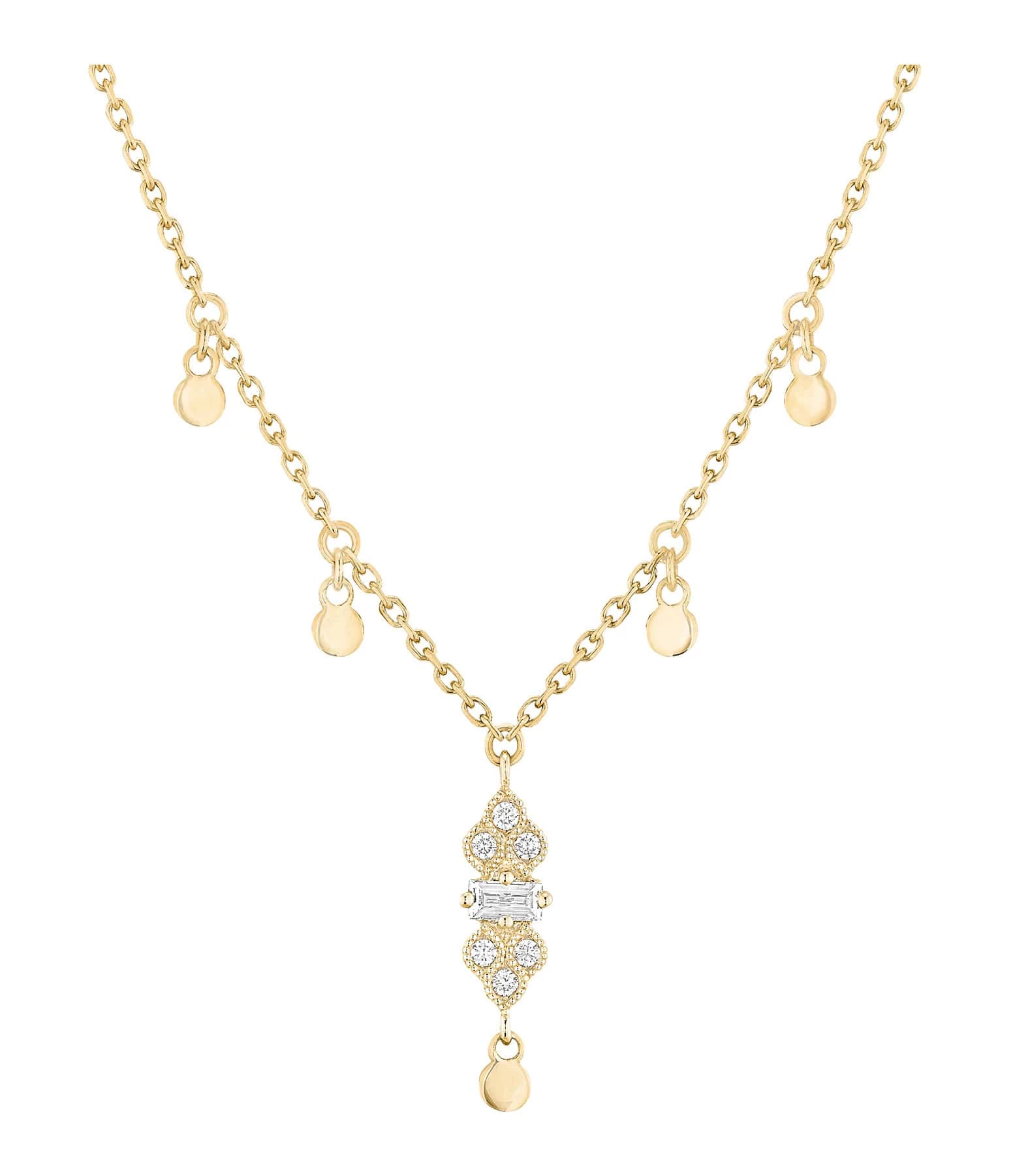 Collier simple en or jaune serti de pampilles d’or et de diamants blancs. Fermoir classique à ressort.