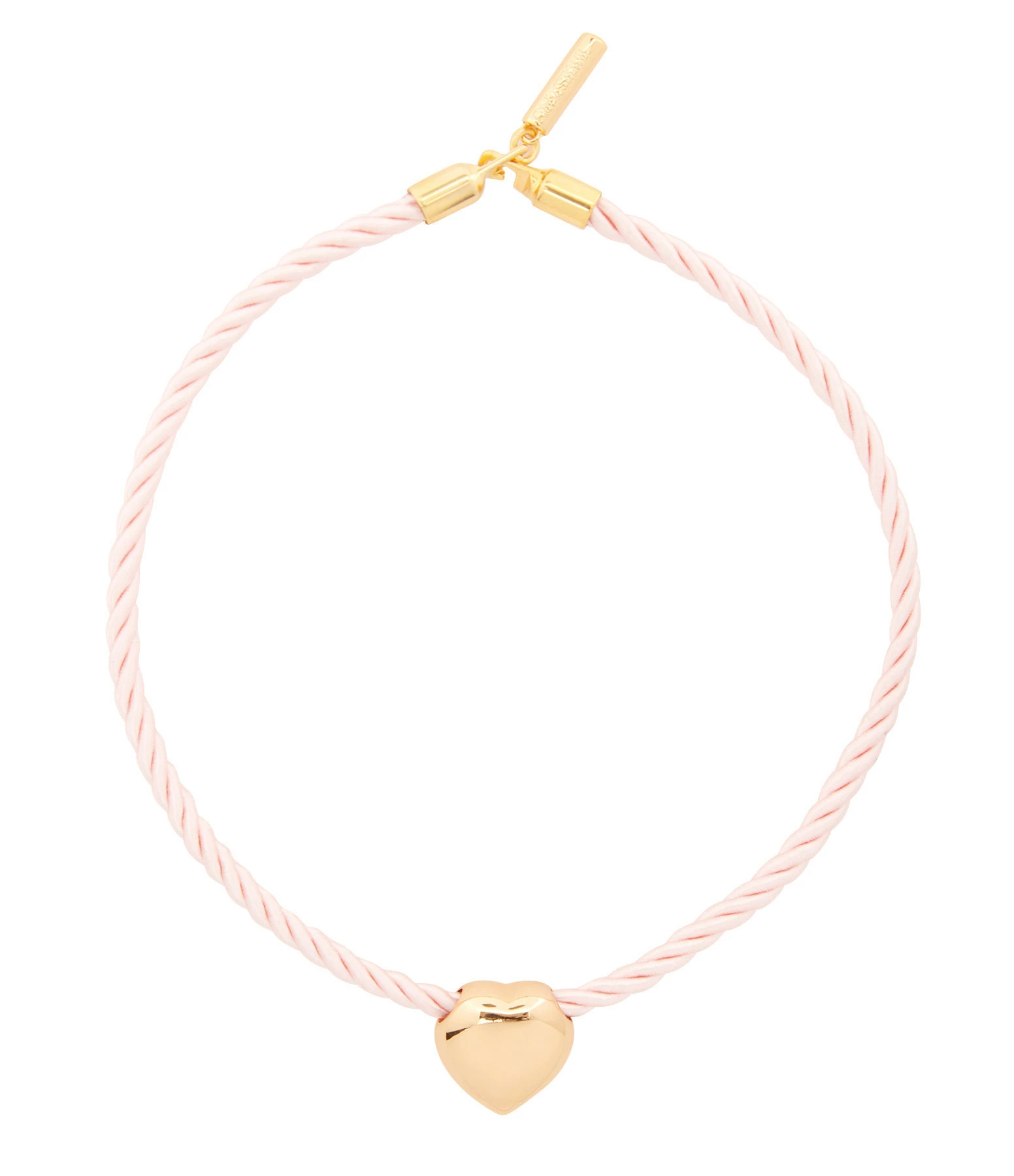 Collier sur cordon en satin rose avec un cœur doré. Fermoir à crochet.