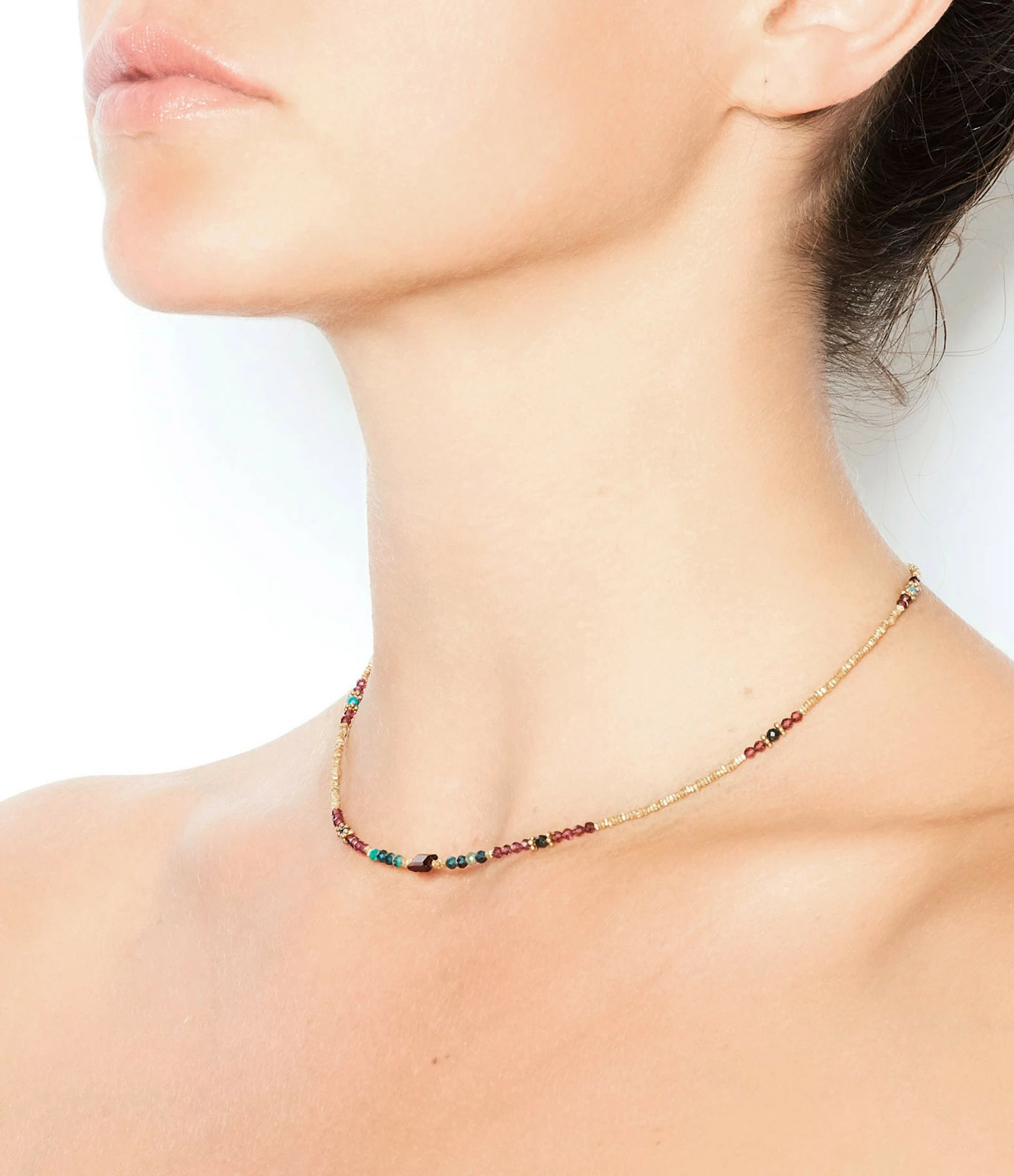 Conseil stylistique : Le collier Meghna veut symboliser par ses pierre, la vision de l’Inde par un mélange de couleurs et de formes.