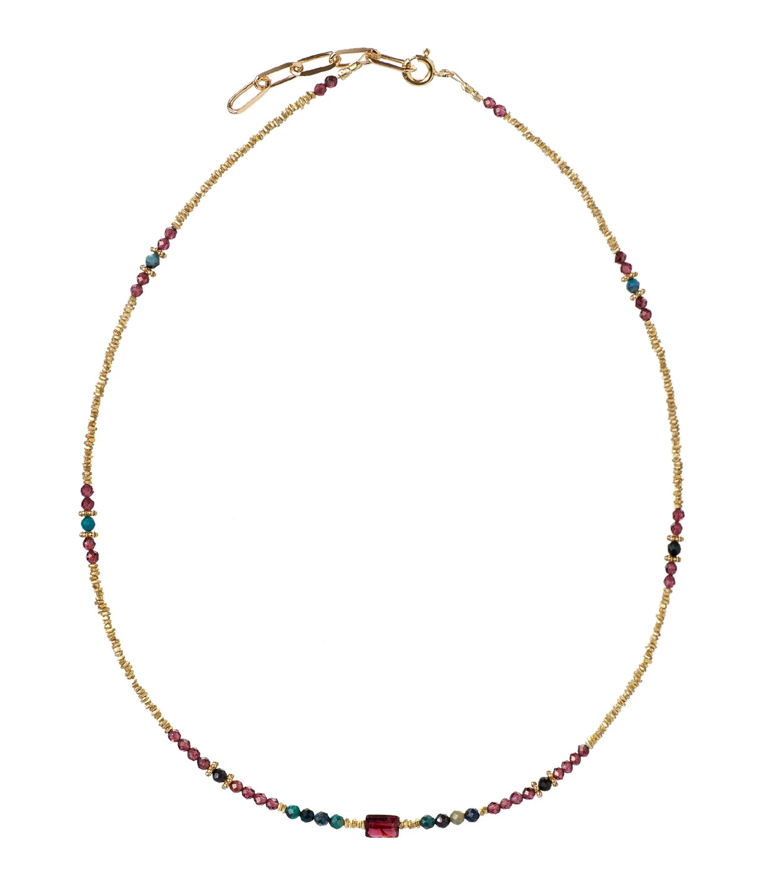 Collier en perles palquées or et perles de Grenat et Chrysophase. Fermoir classique à ressort avec chaîne d’ajustement de 3 cm.