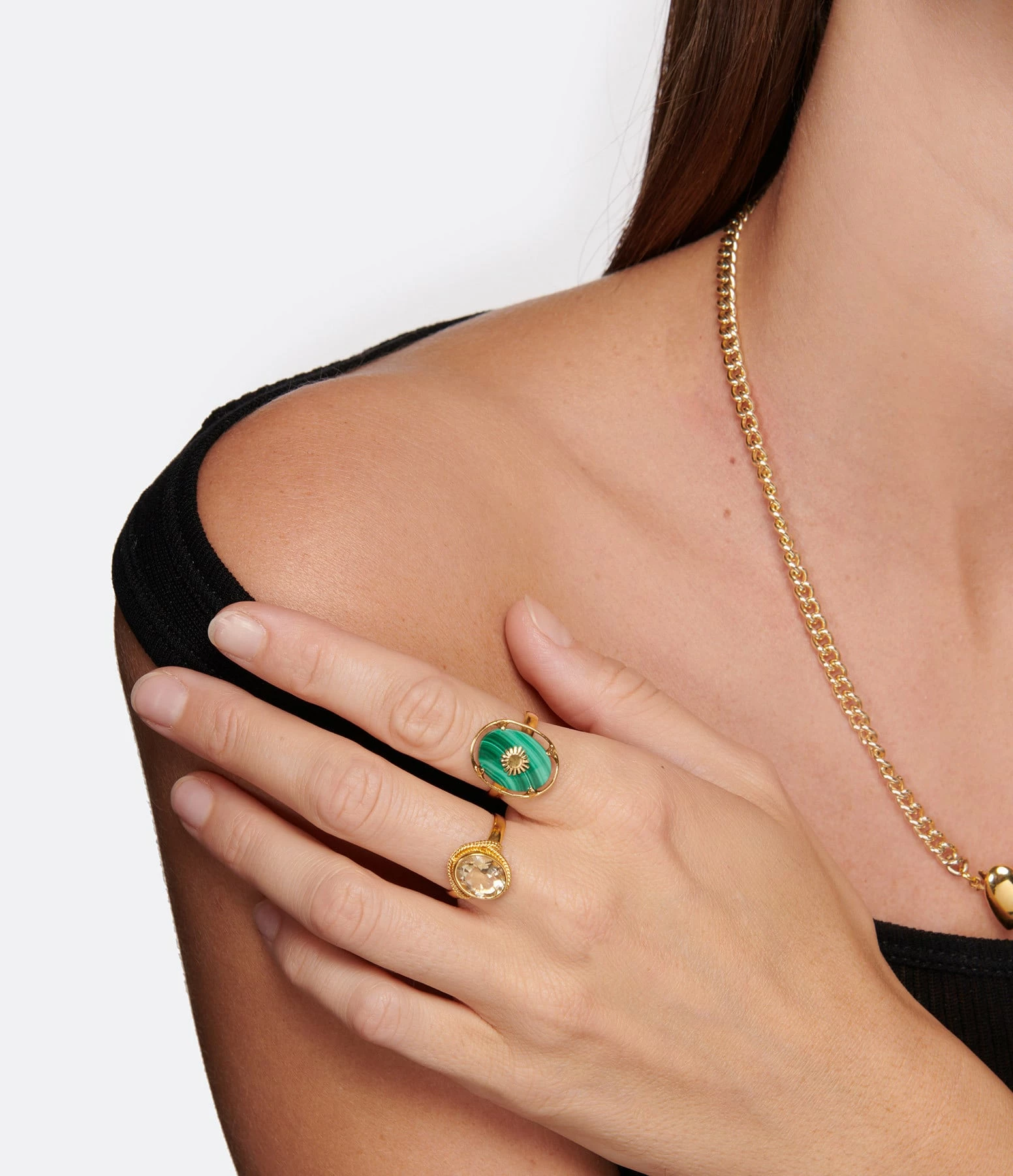 Bague en argent doré ornée d’une pierre malachite avec un soleil au centre.