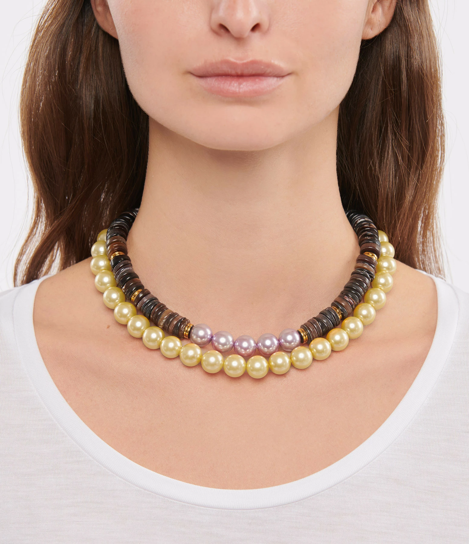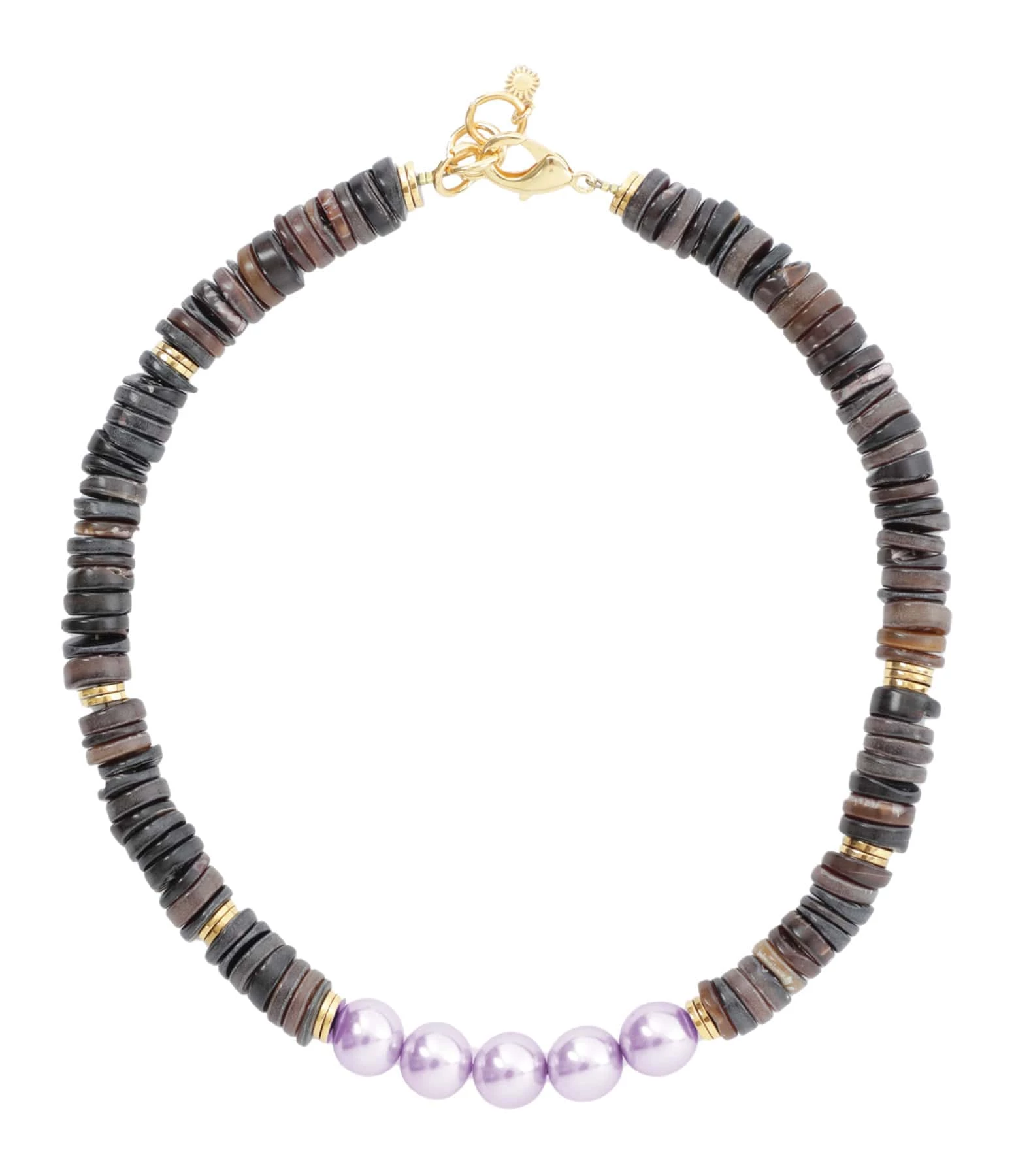 Collier en coquillage et hématites avec cinq perles en verre nacrées violettes sur chaîne en argent doré. Fermoir classique à ressorts.