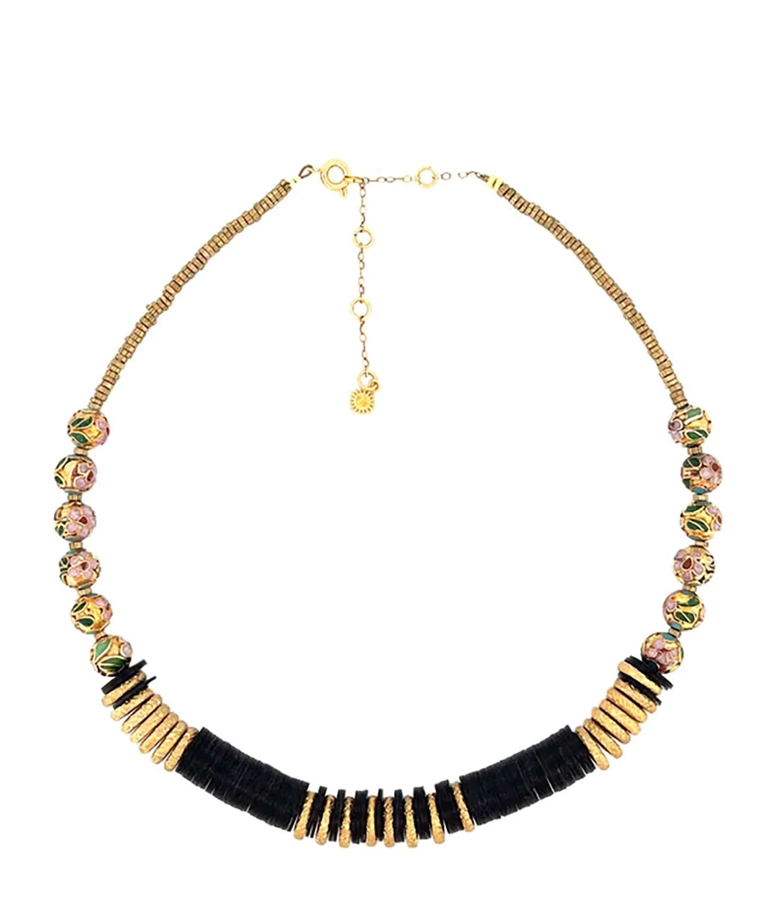 Collier en perles émaillées multicolores, vinyles noirs et laiton doré. Fermoir classique à ressort avec chainette de réglage.