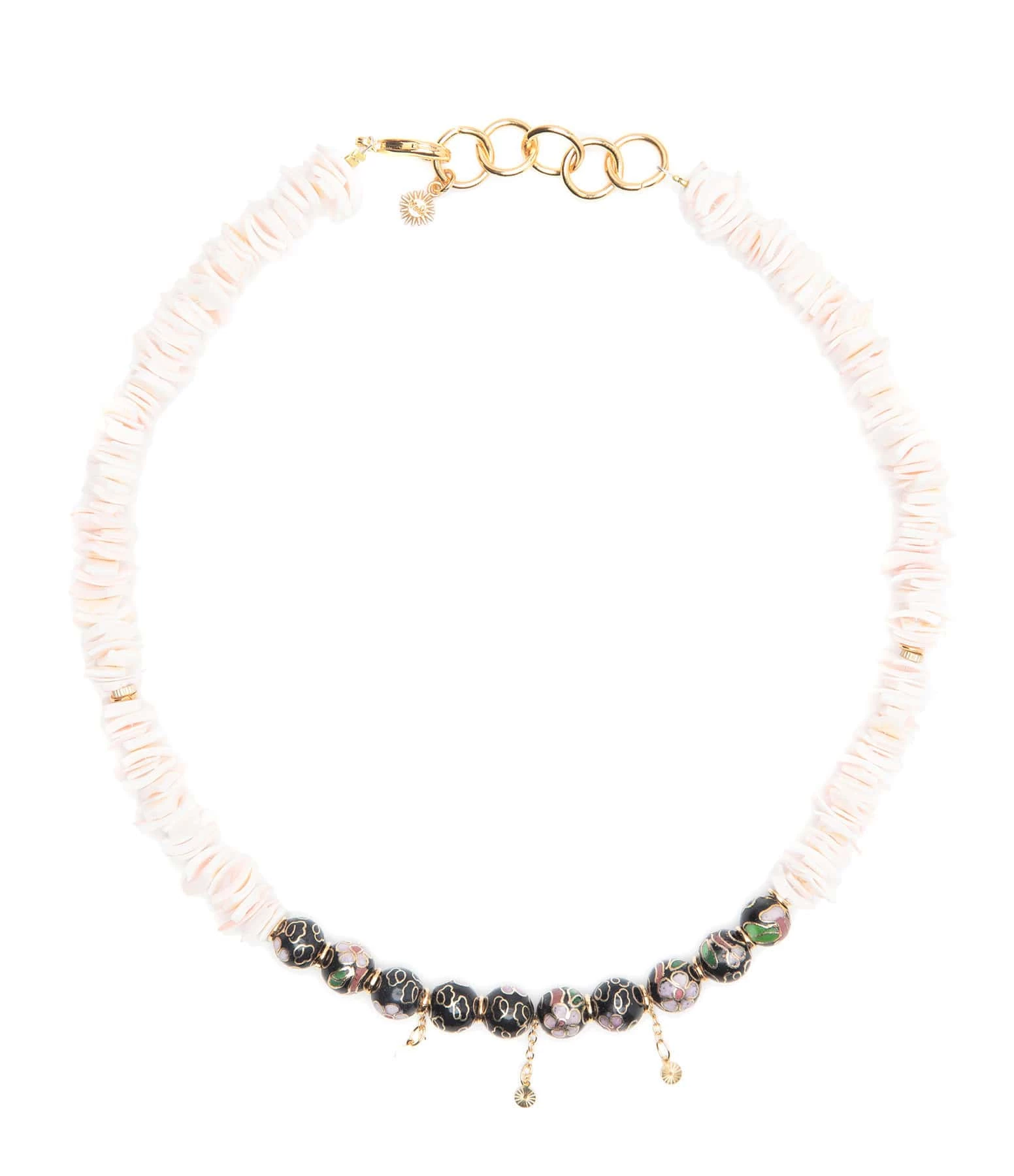 Collier en coquillage rose avec dix perles en verre noir à motif coloré sur chaîne en argent doré. Fermoir classique à ressorts.