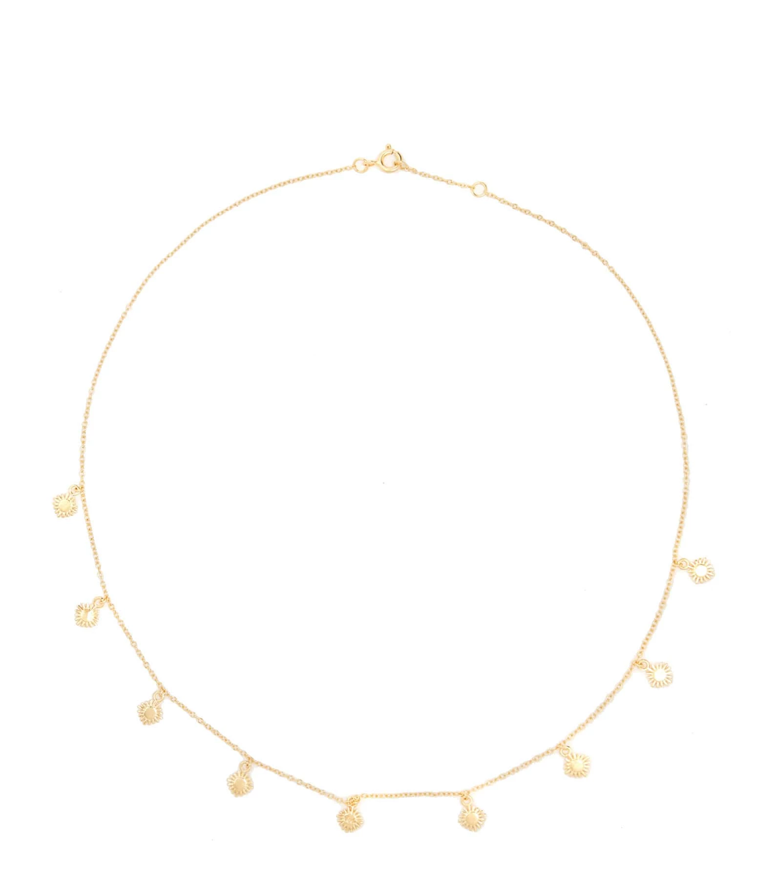 Collier chaîne en argent doré orné de petits pendentifs soleil. Fermoir classique à ressort à deux niveaux.