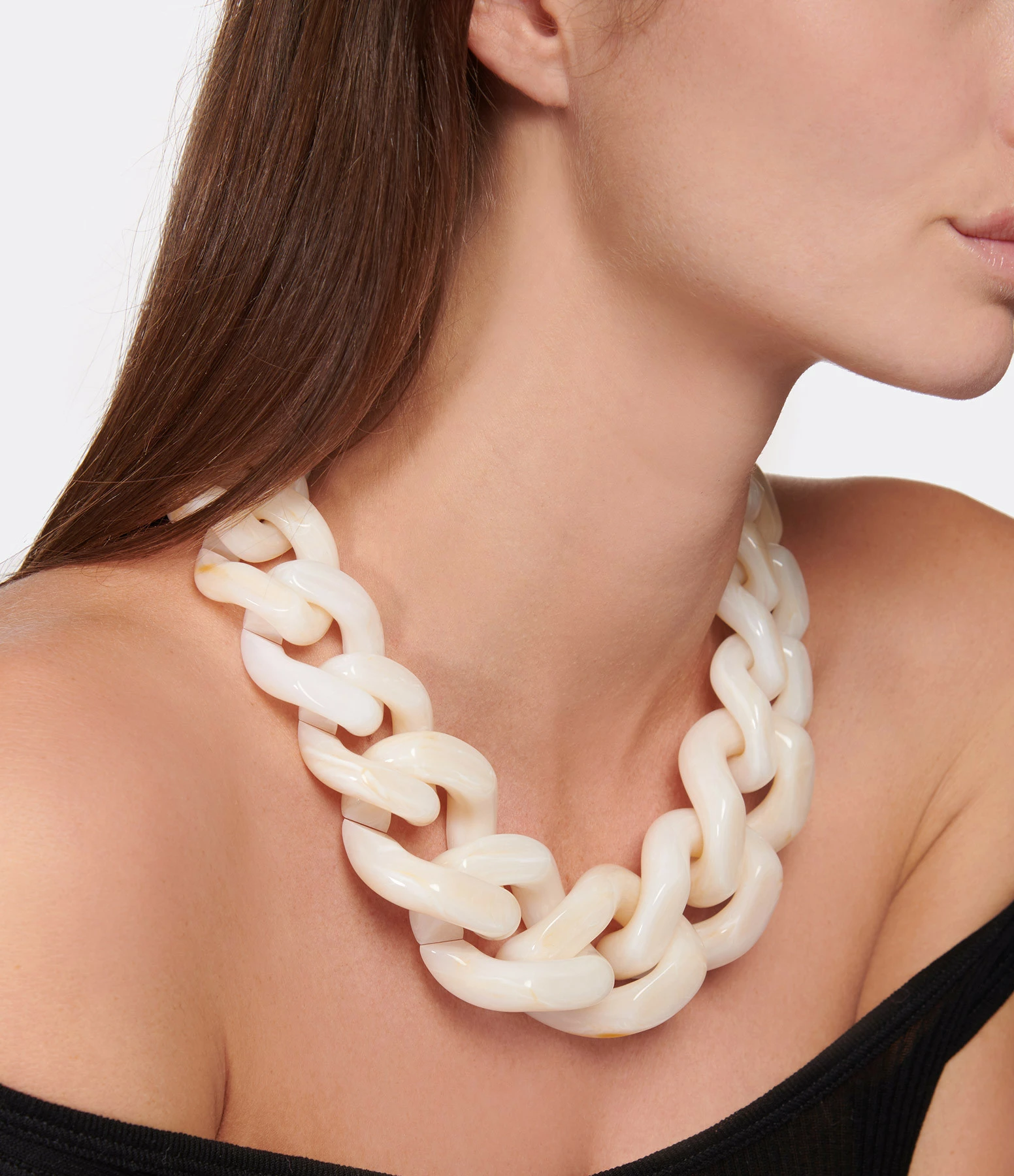 Collier blanc marbré à gros maillons. Fermoir classique à ressort.